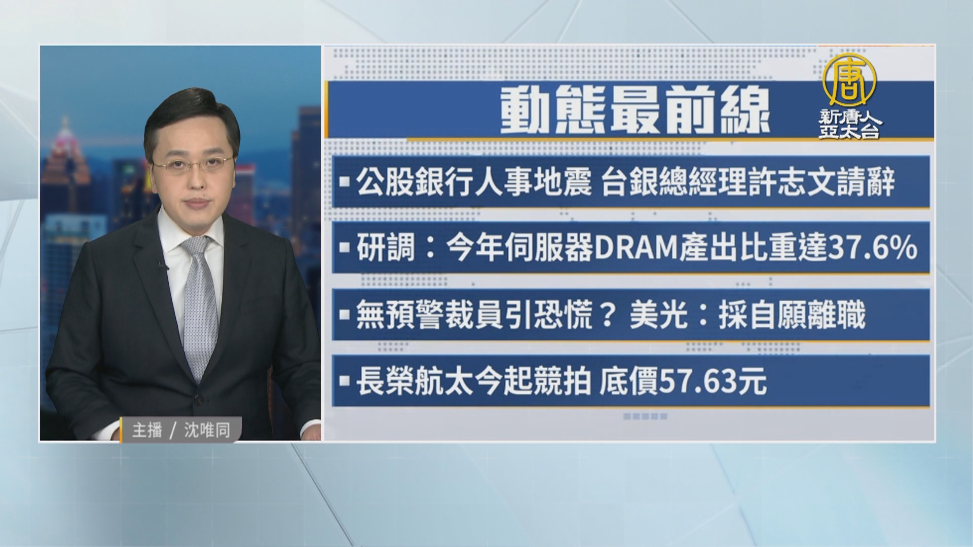 【新唐人亞太台 2023 年 02 月 20 日訊】接著帶您看到產業動態,國銀龍頭台灣銀行今日傳出高層人事異動,台灣銀行總經理許志文因身體因素請辭,由台銀副總林麗婈暫代。研調機構 TrendForce 今日表示,今年伺服器DRAM產出比重達37.6%?,超越 Mobile DRAM 的 36.8%。記憶體大廠美光日前宣布人員精簡、自願離職計畫,傳出採取無預警裁員手段,引發員工感受複雜,美光今天澄清,相關員工參與會談後,以照顧員工感受為先,遵循自願方式離職,流程均符合台灣法律規範。長榮航太上市前辦現金增資 2/20開始競拍底價57.63元。