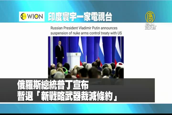 【新唐人亞太台 2023 年 02 月 22 日訊】最後是印度寰宇一家電視台報導:俄羅斯總統普丁宣布,暫時退出與美國的「新戰略武器裁減條約」。