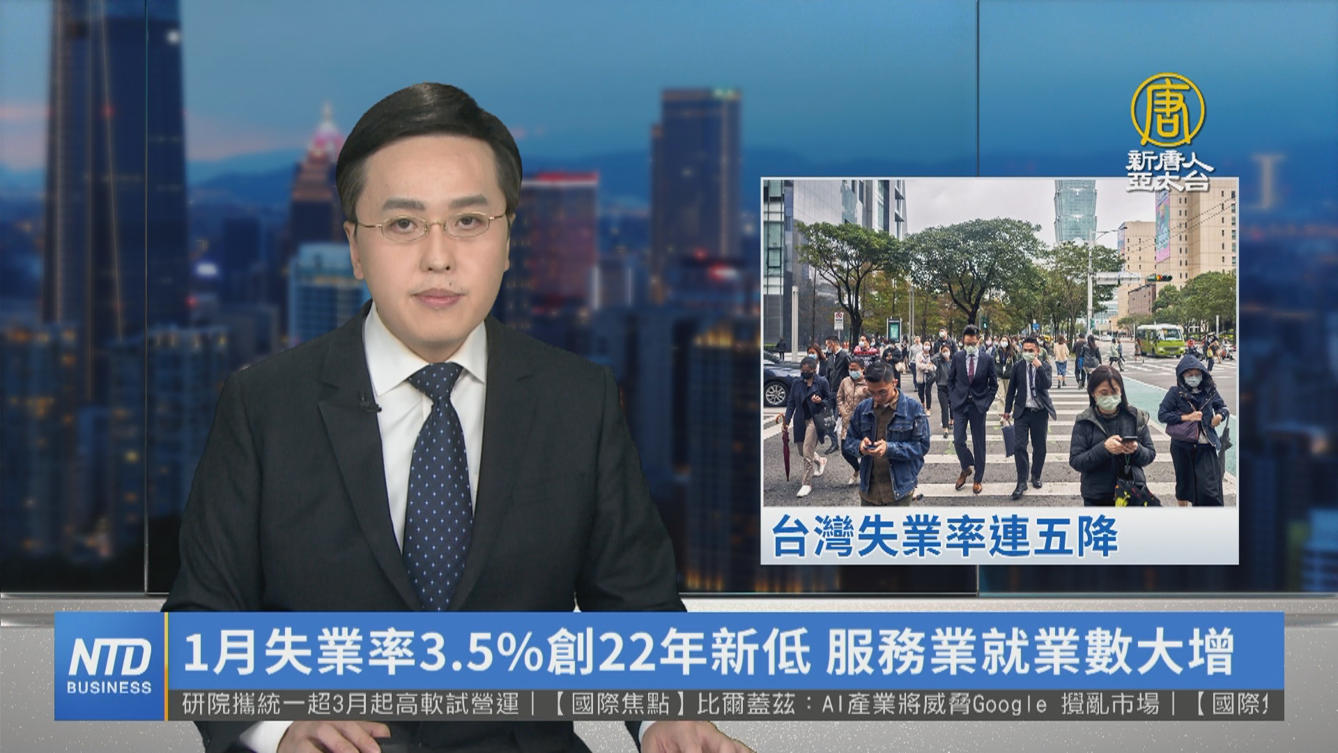 【新唐人亞太台 2023 年 02 月 22 日訊】主計總處今天公布1月失業率3.5%,不僅連續5個月下降,更創下近22年同期新低。在邊境解封的激勵下,服務業就業人數大增1.9萬人,工業部門也增加2000人。官員表示,目前尚未看到景氣對就業的影響。主計總處也公布最新經濟預測,下修今年經濟成長率到2.12%;消費者物價上漲率預測值則為2.16%,上修0.3個百分點。