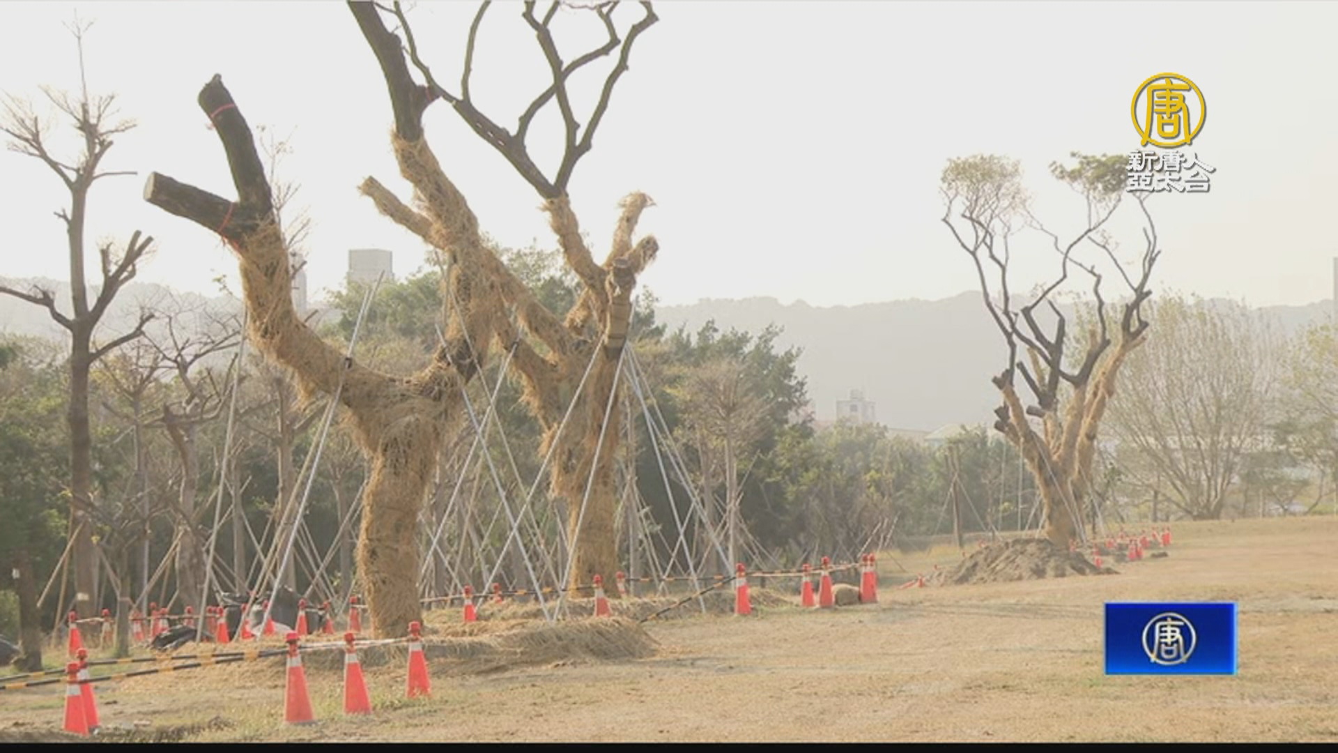 移植到高美館的雨豆樹,綁上稻草席,在廣闊的小山丘伸展枝葉,也種下新希望。