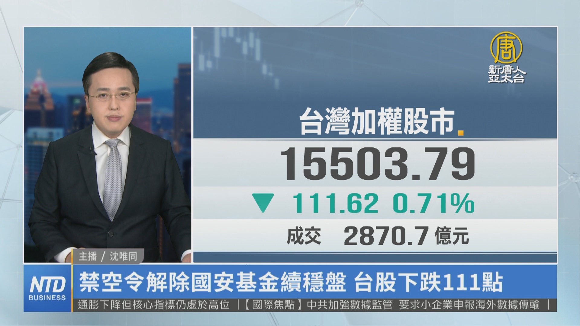 【新唐人亞太台 2023 年 02 月 24 日訊】新聞一開始帶您關心國際股市,美國勞動力市場表現強勁,但投資人審慎評估,聯準會未來政策走向,華爾街股市23日開高,輝達(Nvidia)大漲14%,帶動科技股和晶片股上攻,四大指數尾盤收漲。亞洲股市今天漲跌互見。台股今天受到金管會禁空令放寬影響,儘管國安基金暫不退場,不過台股市場,尾盤出現爆量下殺,加上連續假期效應,賣壓出籠,加權指數來到15,503.79點,下跌111.62點,三大法人賣超89.12億元。
