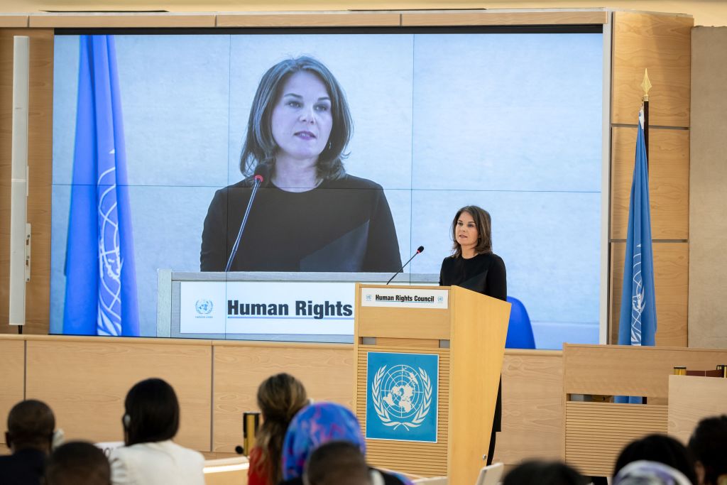 德國外交部長27日在日內瓦舉行的第52屆聯合國人權理事會會議上發表談話。(圖/GettyImages)