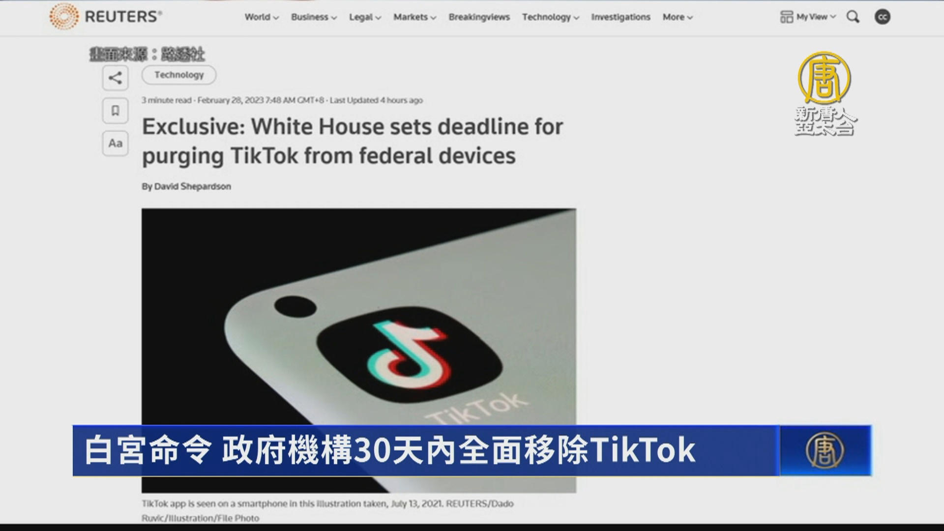 【新唐人亞太台 2023 年 02 月 28 日訊】路透社報導,星期一,白宮給政府機構30天的時間,確保他們沒有在聯邦設備和系統上安裝TikTok。報導指出,美國行政管理和預算局主任告訴各機構,為了保護美國數據安全,所有聯邦機構都必須從手機和系統中刪除TikTok,也禁止進入他們的網站。
