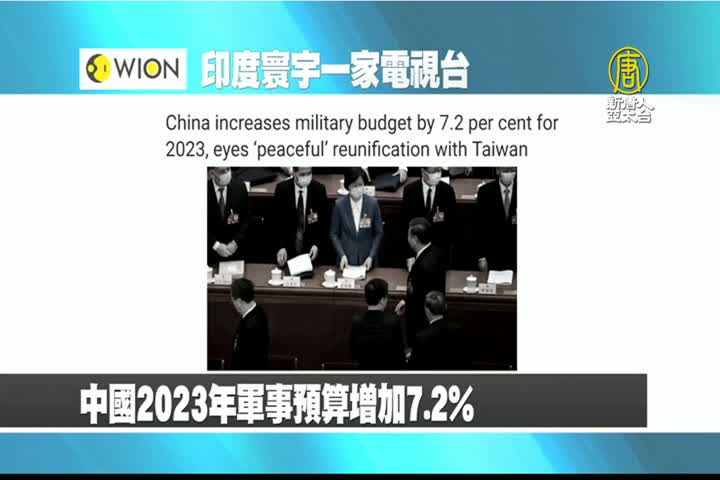 【新唐人亞太台 2023 年 03 月 06 日訊】最後是印度寰宇一家電視台報導:中國2023年軍事預算增加7.2%。