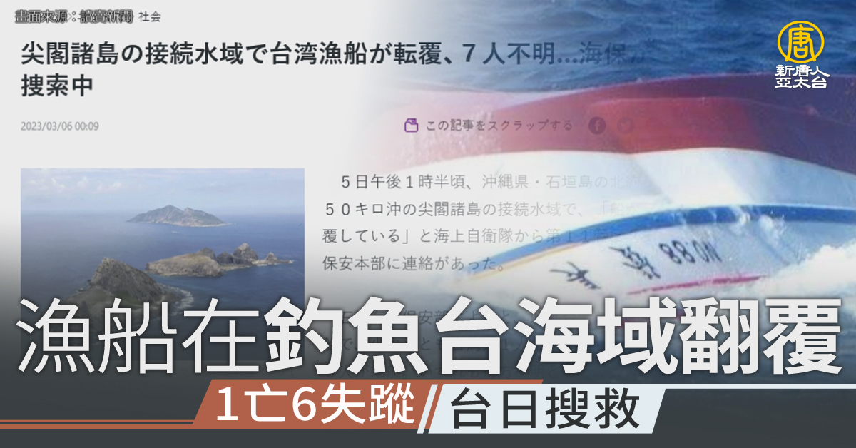 【新唐人亞太台 2023 年 03 月 06 日訊】日媒報導,在台灣時間5日下午12點半左右,第11管區海上保安本部接獲日本海上自衛隊的通知,沖繩縣石垣島北方約150公里處釣魚台海域,有一艘台灣船籍漁船翻覆,船上載有1名台灣人及6名印尼人,日方出動4艘巡邏船在附近持續搜索,台灣海巡也出動連江艦前往救援。根據日媒的最新消息,稍早在船內尋獲1具遺體,其他6人仍下落不明。