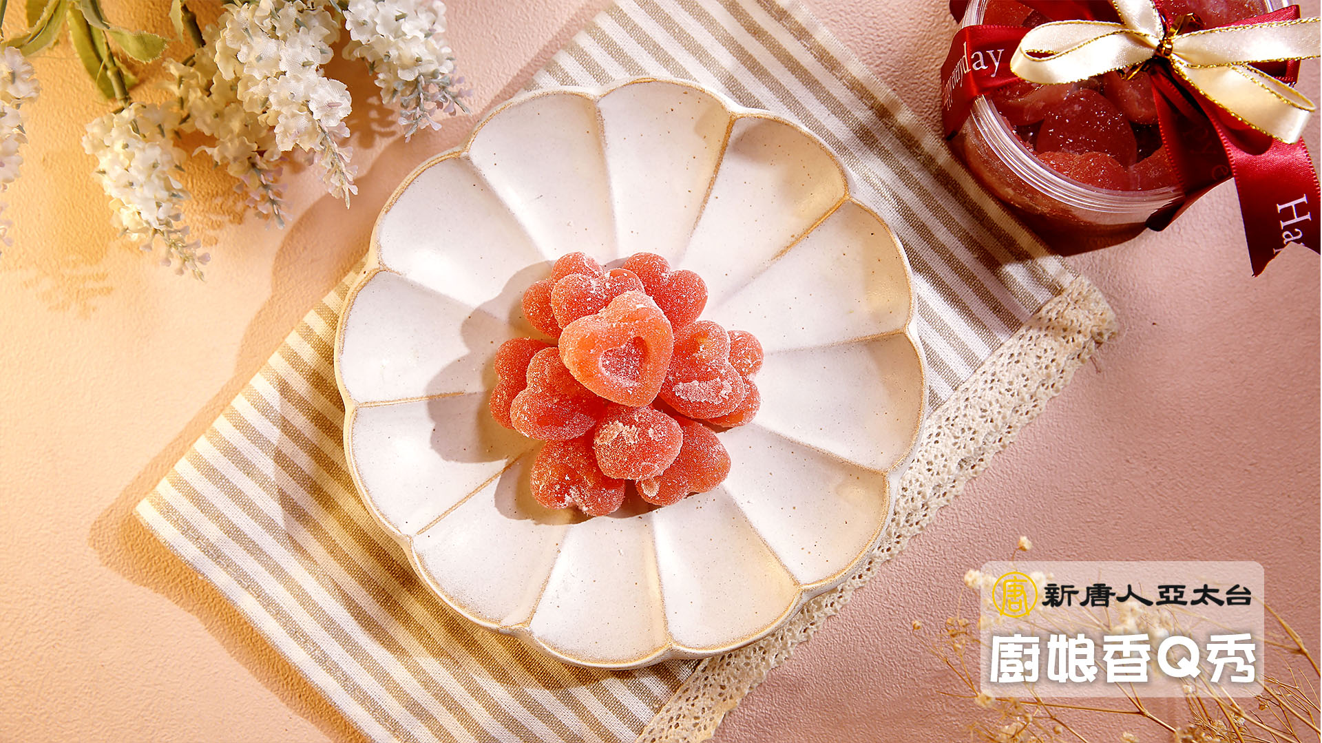 簡單好做Q彈又不黏牙的香檳草莓藏心軟糖,透過烘焙名師 麥田金 老師的分享,讓大家吃的甜蜜又開心,用來提味的檸檬酸,是用很多檸檬汁結晶的。明膠粉又叫吉利丁粉是動物膠,吃素者可以將香檳酒改成蘋果汁,用吉利T代替明膠粉, 但操作手法有些不同。電子秤上裝木板隔熱,就可以邊煮邊稱重量。糯米紙磨成粉即是糯米紙粉。第二道腰果杏仁藜麥堅果棒又稱能量棒,吃了朝氣十足!杏仁果、腰果、紅藜麥、黃金亞麻籽都要烤熟喔!加奶油是為了不黏牙。煮糖果時,室內不能有風,所以冷氣或抽油煙機都不能開。