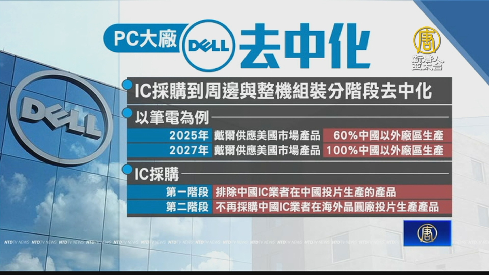 【新唐人亞太台 2023 年 03 月 14 日訊】因應地緣政治風險,媒體報導PC品牌大廠戴爾,IC採購將分階段去中化,從最上游的IC採購政策到中、下游周邊與整機組裝都有所規範。以筆電為例,戴爾要求2025年開始,戴爾供應美國市場產品,60%必須由中國以外廠區生產,2027年美國市場產品在中國以外地點組裝比例,必須來到百分之百。IC採購將分階段去中化,最快2026年開始,優先排除中國IC業者在中國晶圓廠投片產品。