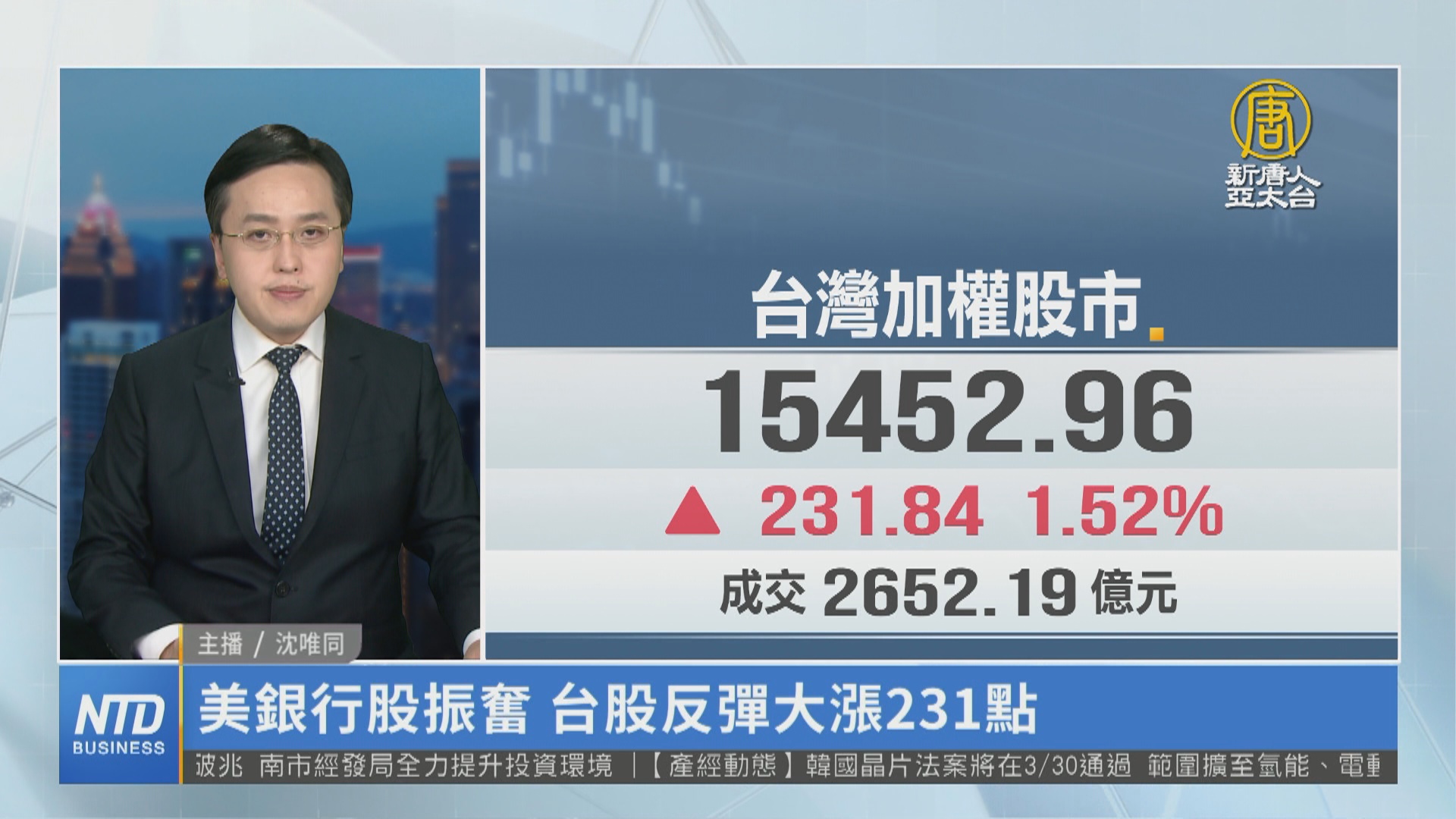 【新唐人亞太台 2023 年 03 月 17 日訊】新聞一開始帶您關心國際股市,歐洲央行週四 (16 日) 宣布升息2碼後,市場預期聯準會升息1碼機率較高,加上11家美國大型銀行,宣布向第一共和銀行注入300億美元,緩解投資人焦慮,多項利多消息帶動美股走高。台股在主要權值股台積電,尾盤拉高,順利完成填息,鴻海與聯發科加碼帶動,加權指數勁揚231.84點,收復5日線,不過週線仍下跌73點。