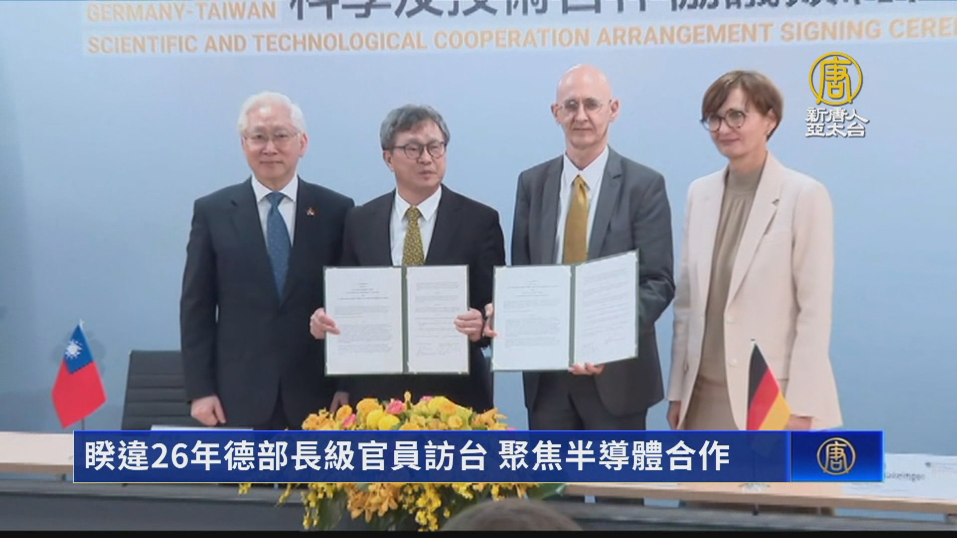 【新唐人亞太台 2023 年 03 月 21 日訊】德國教育及研究部部長瓦特辛格率團訪台,這是26年來,第一位訪台的德國部長級官員。今天上午會晤國科會主委吳政忠,共同見證台德簽署科學及技術合作協議。
