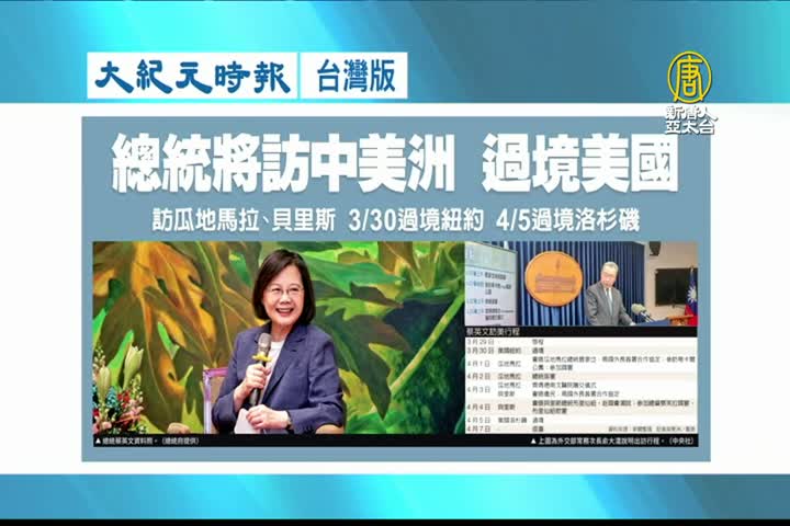 【新唐人亞太台 2023 年 03 月 22 日訊】接著看到大紀元時報台灣版報導:中華民國總統蔡英文29日將訪問中美洲,並過境美國。