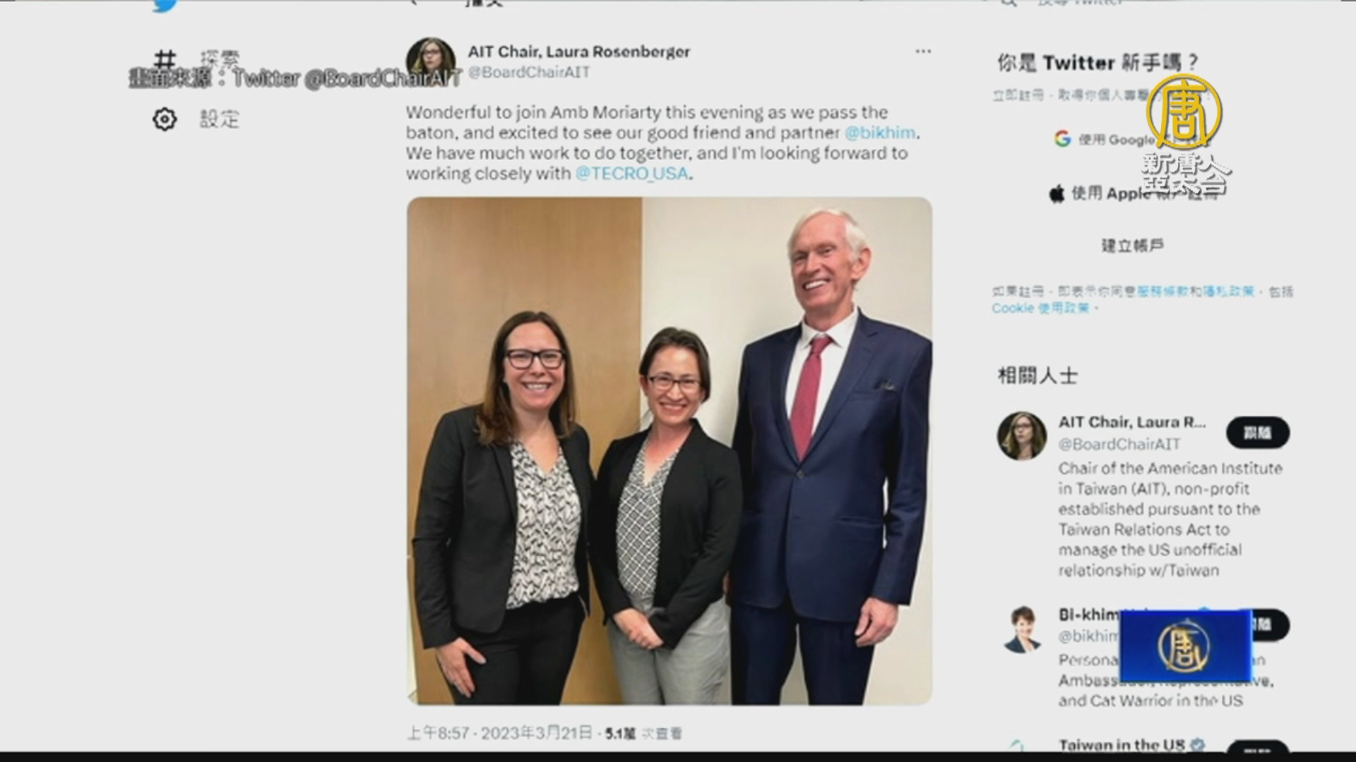 【新唐人亞太台 2023 年 03 月 22 日訊】美國在台協會(AIT)新任主席羅森伯格20日上任,她新開設的推特帳號,(21日)貼出第一張照片,就是和台灣駐美代表蕭美琴、剛卸任的前AIT主席莫健合影;蕭美琴也隨及貼出另一張3人自拍照。羅森伯格表示,很高興和「好友與夥伴美琴」見面,期待在此重要時刻與台灣朋友密切合作,繼續擴大並深化密切的夥伴關係。
