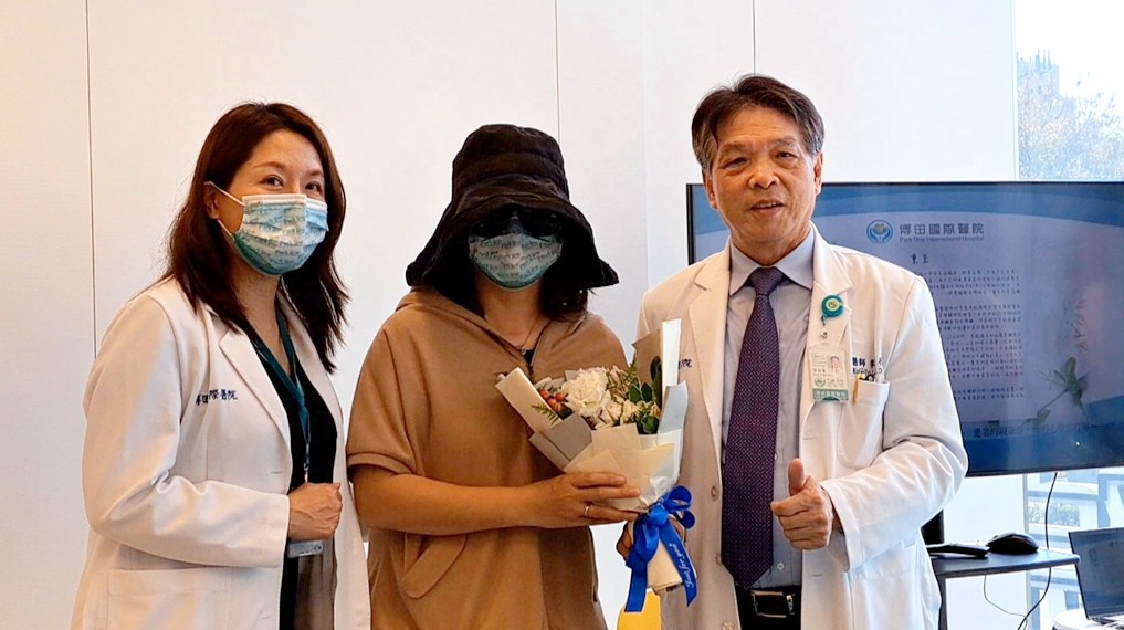 博田國際醫院副院長阮蘭婷(左)與肝膽胰臟外科副院長李金德(右),康復的郭女士(中)。(圖/葉子棻)