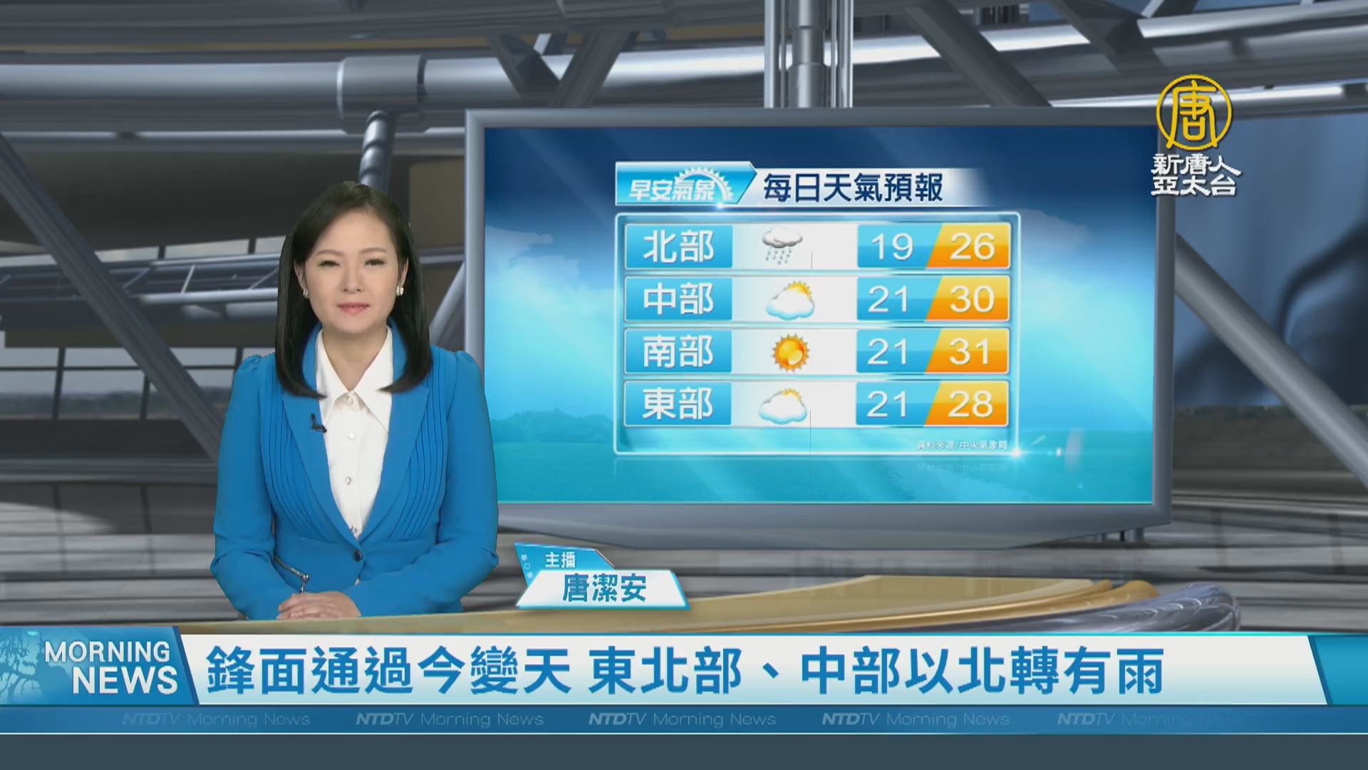 【新唐人亞太台 2023 年 03 月 24 日訊】歡迎您收看3月24日的早安新唐人,我是唐潔安,先來帶您關心天氣。中央氣象局最新預測顯示,今天有微弱鋒面通過,東北部及東部會有局部短暫陣雨,中部以北也有機會出現零星降雨。在氣溫部分,北台灣高溫下降,不過仍有25、26度,其他地區則在27到31度左右,其中高雄近山區或河谷仍有局部36度以上高溫發生的機率,而各地低溫約在20到22度之間。帶您來看到國際媒體重要訊息。