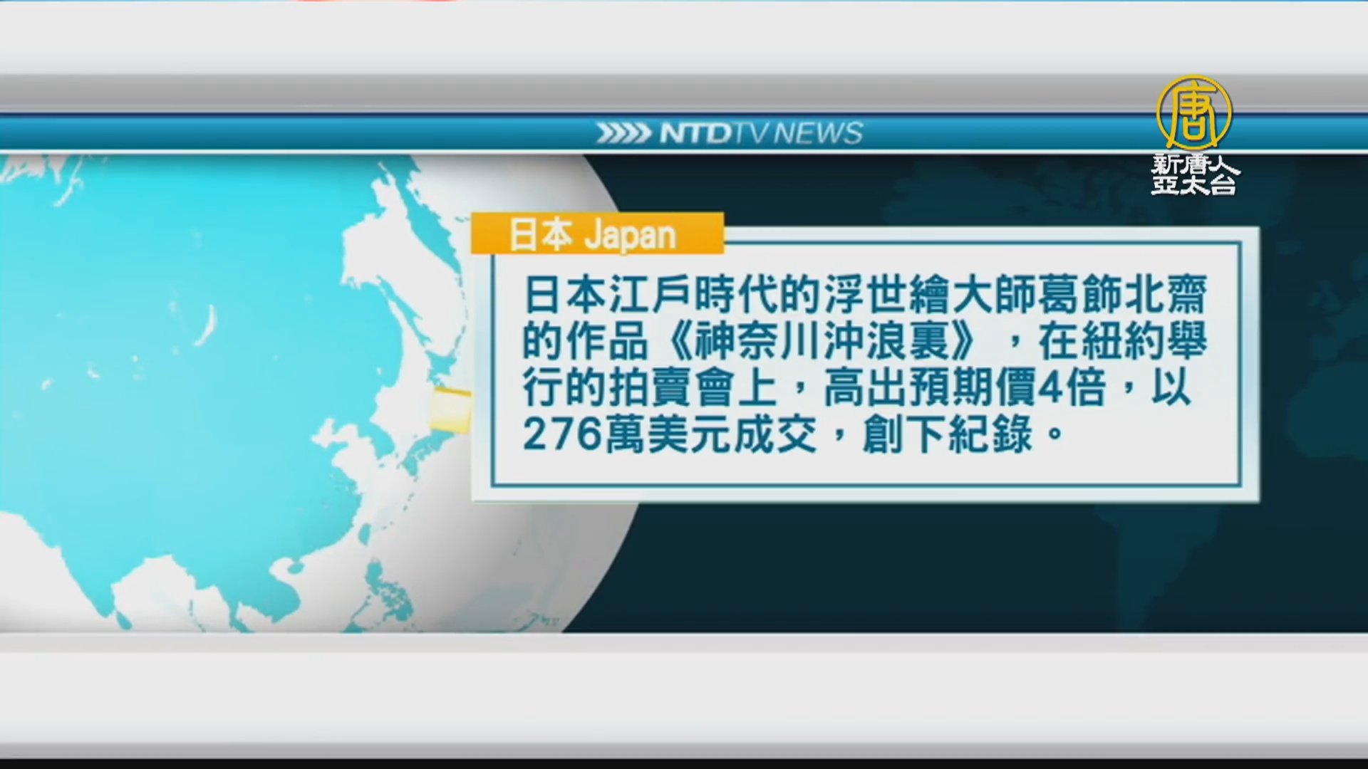 日本江戶時代的浮世繪大師葛飾北齋的作品《神奈川沖浪裏》,在紐約舉行的拍賣會上,高出預期價4倍,以276萬美元成交,創下紀錄。