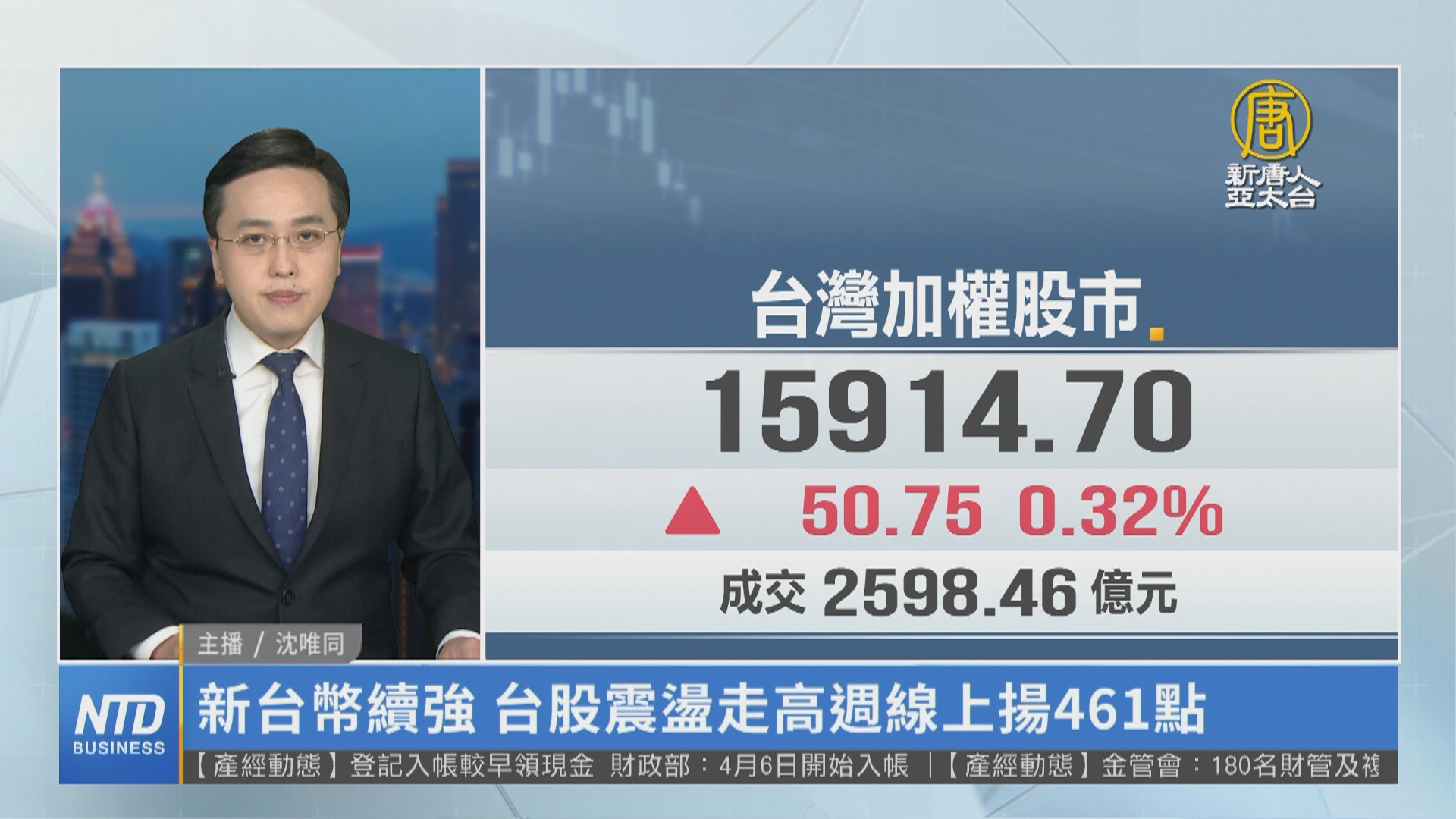 【新唐人亞太台 2023 年 03 月 24 日訊】新聞一開始帶您關心國際股市,美國聯準會升息出現尾聲訊號,財長葉倫出面安撫市場情緒,美股主要指數震盪走高,費辦指數更是大漲2.7%。台股今天受到美股反彈利多,開高後持續走高,盤中最高點達15921點,創今年以來新高水位,收盤上漲50.75點,收在15890.14點。本週指數合計漲461點,週線拉出長紅。新台幣兌美元匯率,週五以30.353元作收,再度升值1.9分。