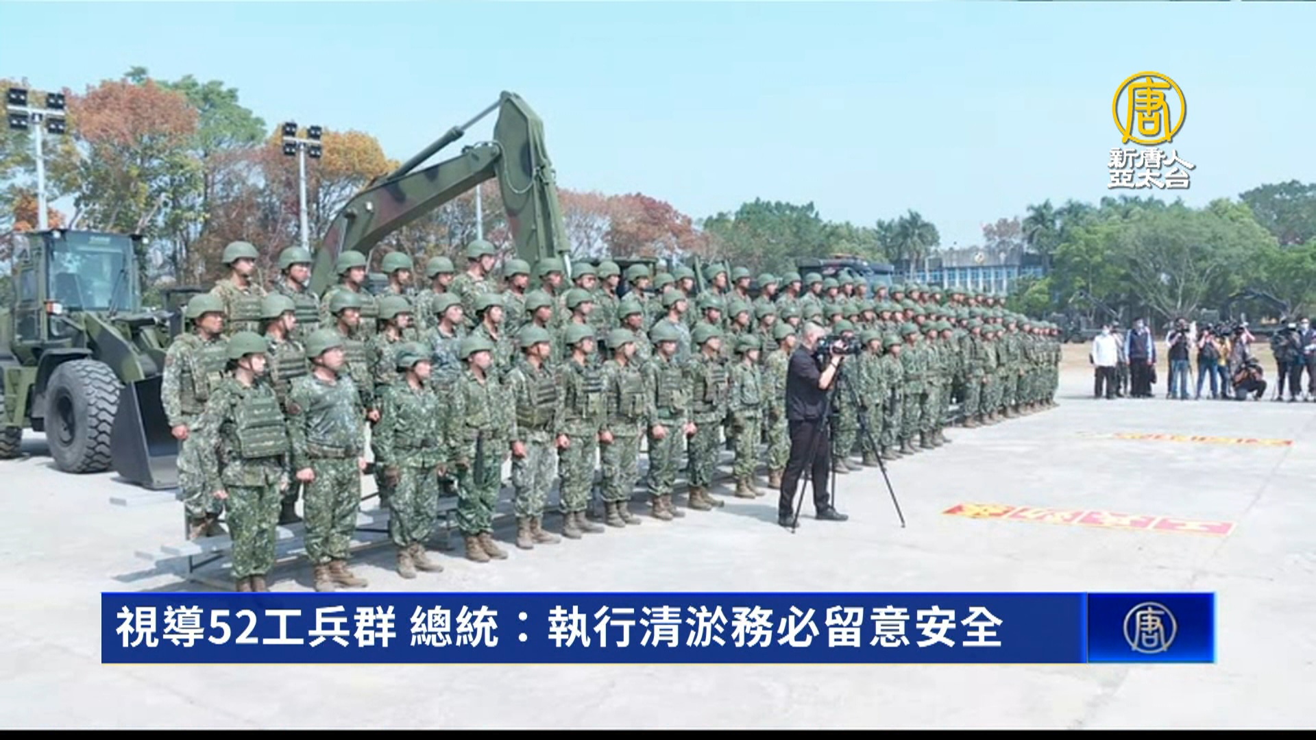 【新唐人亞太台 2023 年 03 月 25 日訊】面對旱象持續,國軍投入水庫清淤工作。總統蔡英文今天(25日)南下嘉義視導陸軍52工兵群時,特別提醒國軍執行任務要注意安全,尤其先前國軍才在曾文水庫疏濬時發生車輛翻覆。蔡英文也觀看工兵架設障礙物,還有近戰格鬥奪刀術訓練。