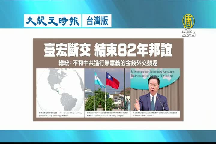 【新唐人亞太台 2023 年 03 月 27 日訊】接著看到大紀元時報台灣版報導:台灣與宏都拉斯斷交,結束82年邦誼,總統蔡英文表示,不和中共進行無意義的金錢外交競逐。