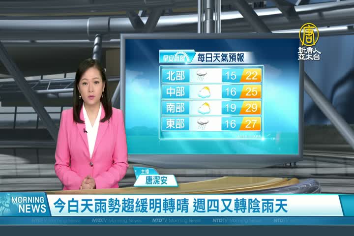 【新唐人亞太台 2023 年 03 月 28 日訊】歡迎您收看3月28日的早安新唐人,我是唐潔安,先來帶您關心天氣。今天受華南雲雨區東移影響,北部、東半部仍有局部短暫雨,中南部局部短暫雨後轉多雲時晴。而受到東北季風持續影響,各地早晚天氣較涼,中部以北及東北部低溫15、16度,其他地方17到20度,今天白天高溫部分,桃園以北及宜蘭大約18、19度,竹苗及花蓮約22、23度,其他地區則可以來到25至28度。帶您來看到國際媒體重要訊息。