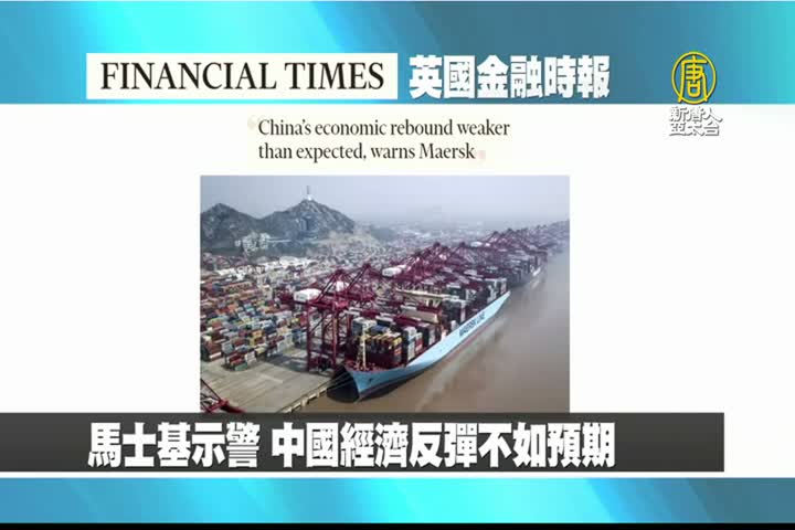 【新唐人亞太台 2023 年 03 月 28 日訊】接著是英國金融時報的報導:疫情與房地產崩潰後,全球航運龍頭馬士基(Maersk)示警,中國經濟反彈不如預期。