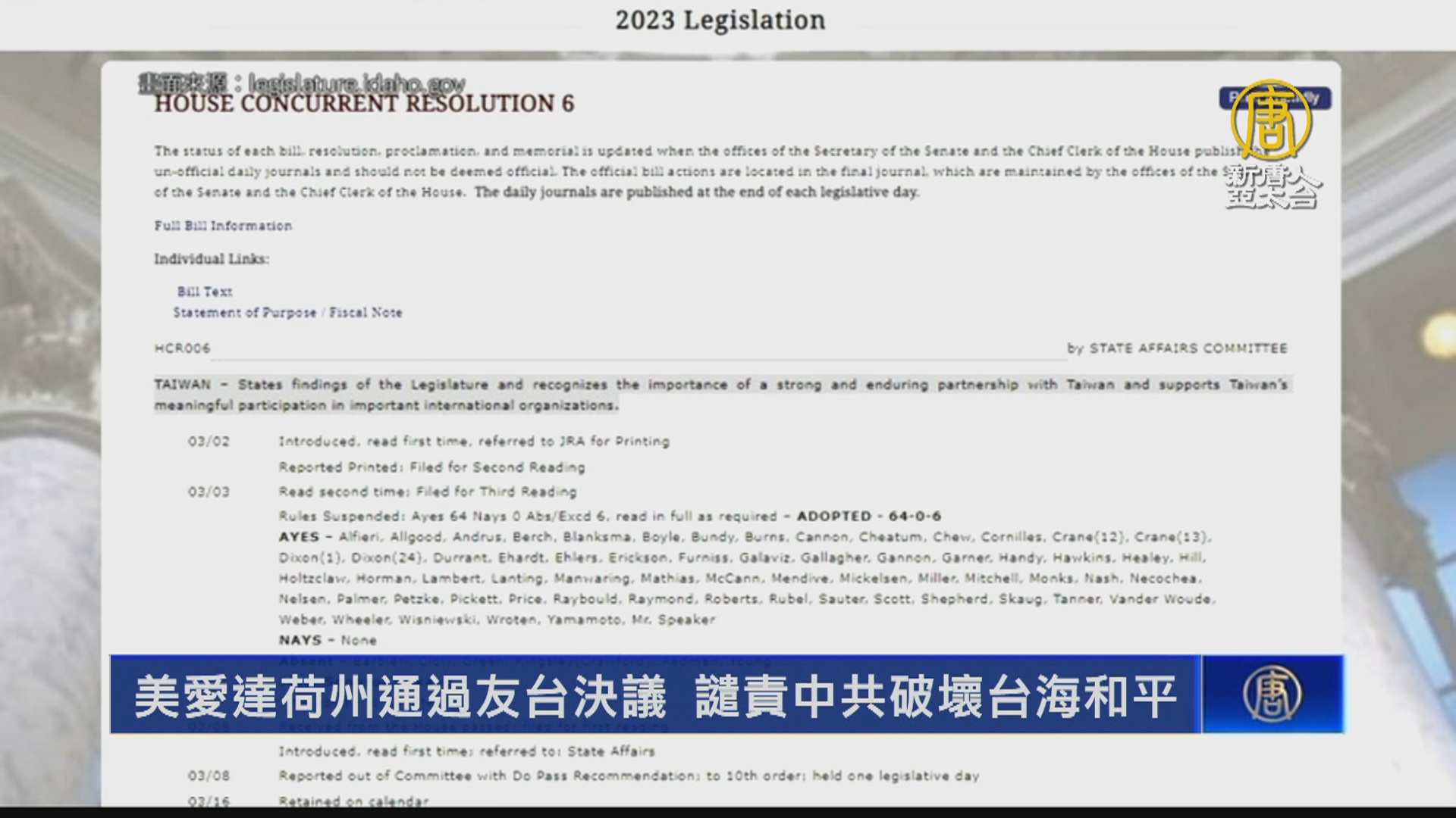 【新唐人亞太台 2023 年 03 月 29 日訊】美國愛達荷州參眾議會在28日,連續第4年通過友台決議,除了重申支持台灣有意義參與國際組織,支持台美洽簽經貿協定,更是首度在決議中譴責中共破壞台海和平,指出共軍在台海和國際領空的軍事行動,威脅地區和全球安全穩定。