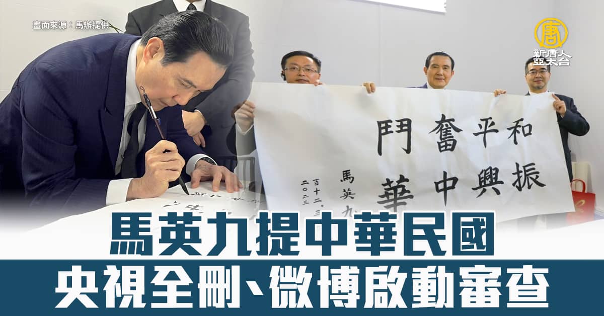 前總統馬英九為期12天的訪中祭祖行,28日首個行程赴南京中山陵謁陵,期間他提及國父孫中山創建民國,發表公開致詞提及中華民國,並落款題民國紀元「百十二」,遭中共官媒央視全部剪掉,只要跟「民國」相關就不能露出。另外,中共也啟動網路審查,微博上看不到任何對「馬英九提中華民國」的相關評論。