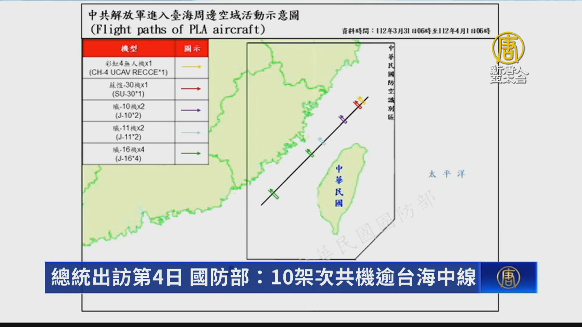 【新唐人亞太台 2023 年 04 月 01 日訊】總統蔡英文29日啟程前往中美洲友邦國家展開「民主夥伴共榮之旅」,今天抵瓜地馬拉。中華民國國防部指出,統計自昨天上午6時起24小時內,偵獲共機18架次,其中逾越海峽中線10架次、共艦4艘次,持續在台海周邊活動。國防部表示,國軍運用任務機、艦 及岸置飛彈系統嚴密監控與應處。