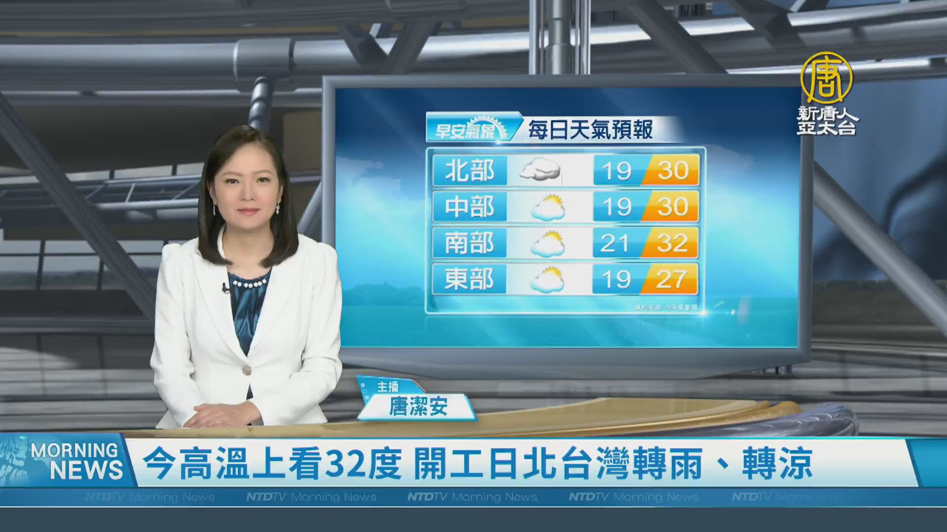 【新唐人亞太台 2023 年 04 月 05 日訊】歡迎您收看4月5日的早安新唐人,我是唐潔安,先來帶您關心天氣。今天是清明連假的最後一天,中央氣象局預測資料顯示,台灣各地及澎湖大多為多雲到晴,僅北部、東半部地區及金門、馬祖有零星短暫陣雨,午後西半部山區亦有零星短暫陣雨。白天全台高溫大多在26度以上,西半部有機會來到30到32度以上,明天受到鋒面影響,將轉為有雨多雲的天氣型態,後天東北季風增強,北部及東北部天氣將轉涼,低溫會大約只有16、17度。帶您來看到國際媒體重要訊息。