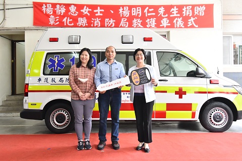 彰化縣長王惠美出席代表接受並表示,非常感謝楊靜惠老師、楊明仁董事長為延續父親楊忠元先生的熱心精神,捐贈消防局最新的高頂救護車,來造福鹿港的鄉親,也感謝地方仕紳挹注消防局相關物資,還有謝謝所有消防同仁、義消的用心,讓彰化救護的服務品質不斷提升。