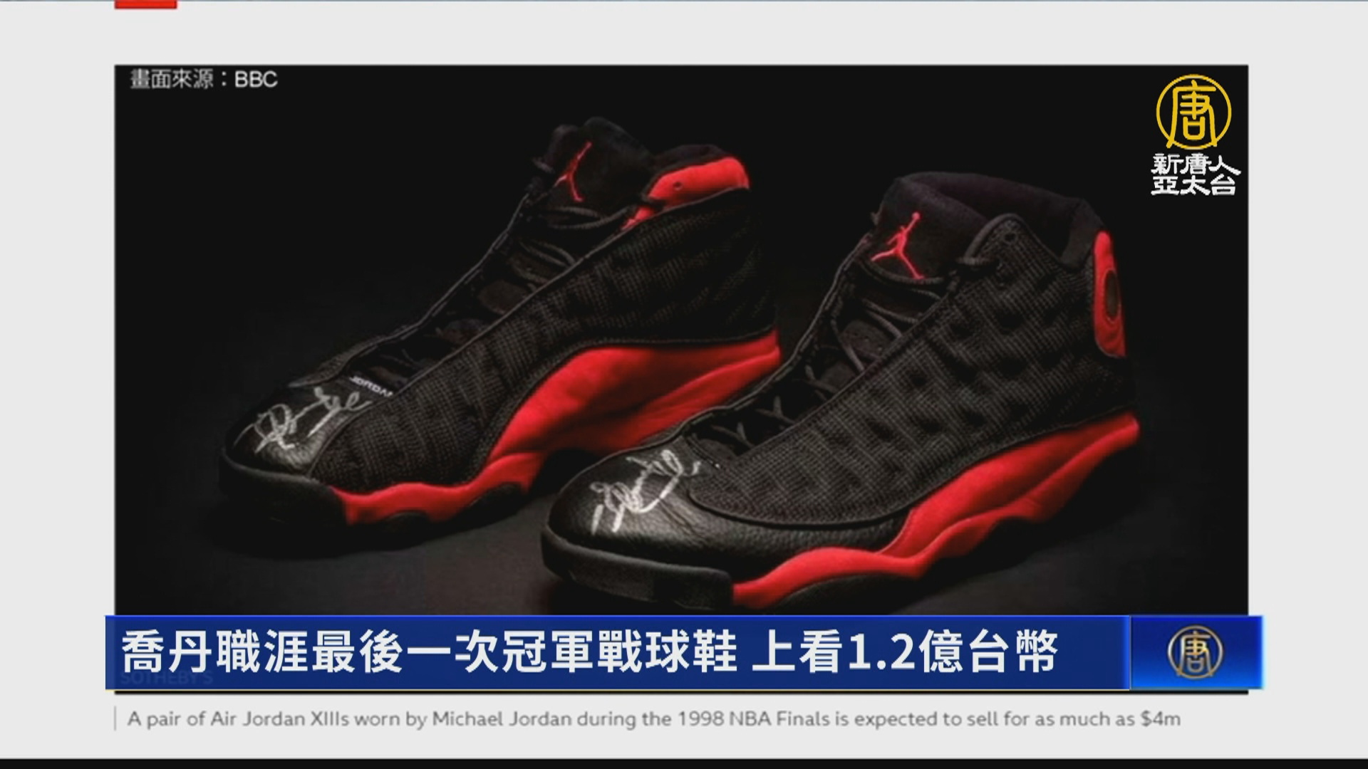 【新唐人亞太台 2023 年 04 月 07 日訊】籃球明星喬丹(MichaelJordan)在1998年,職涯最後一次冠軍戰穿過的球鞋,最近被拿出來上網拍賣,目前喊價來到180萬美金,約台幣5500萬,預估拍賣價格將達到400萬美元,約合台幣1.2億元,將可創下球鞋拍賣新紀錄。在球鞋拍賣歷史的最高價紀錄保持人,是知名歌手威斯特(Kanye West)在2008年葛萊美獎典禮上,所穿的Nike Air Yeezy,後來以180萬美金成交。
