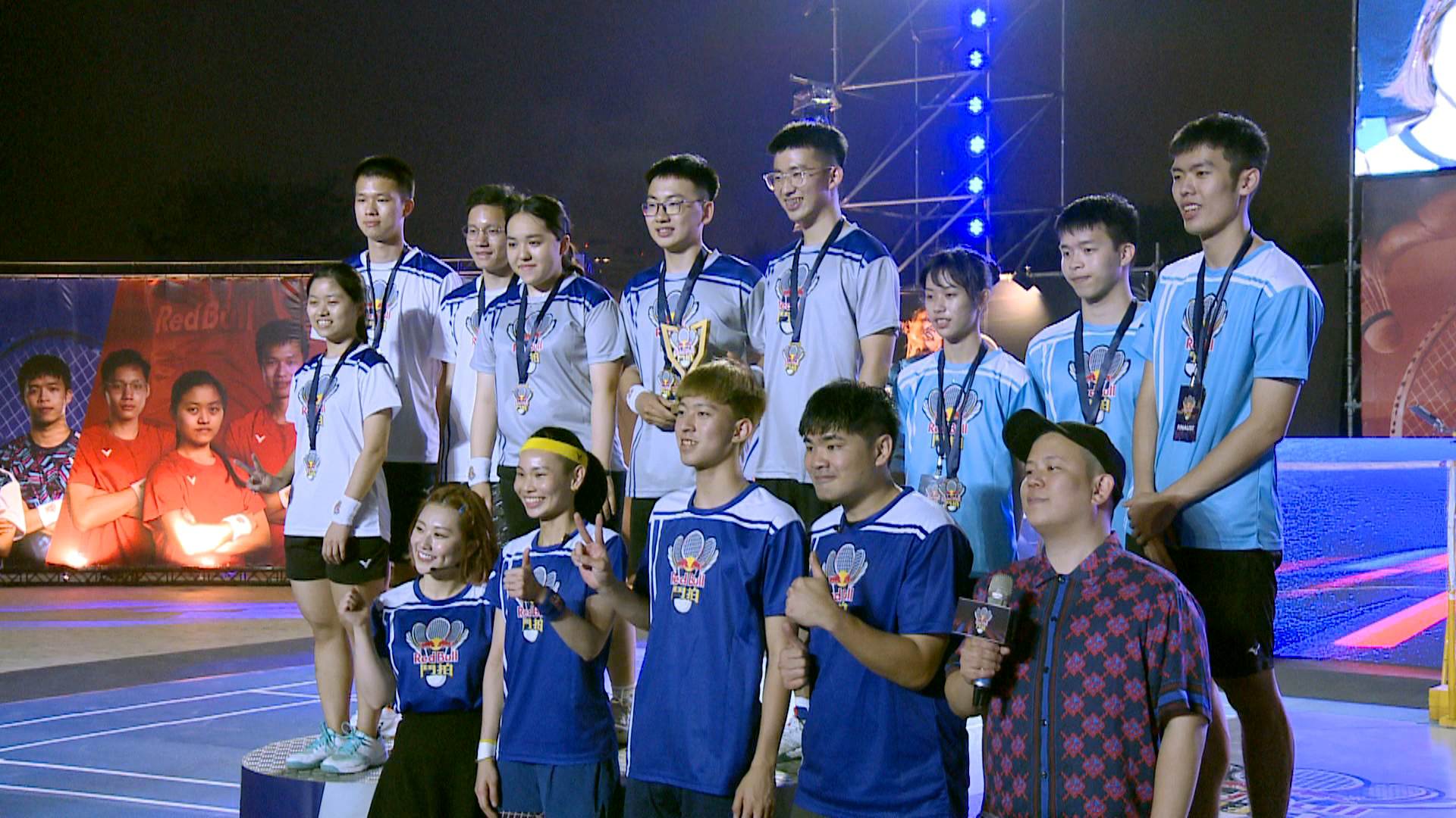 【新唐人亞太台 2023 年 04 月 09 日訊】台首創三對三羽球「鬥拍」8日晚間在高雄衛武營戶外廣場舉辦決賽,北中南分站冠軍以羽球三對三進行循環賽激戰,最終由地主隊高雄科技大學羽球校隊勇奪冠軍,獲得與戴資穎小隊的鬥拍機會。