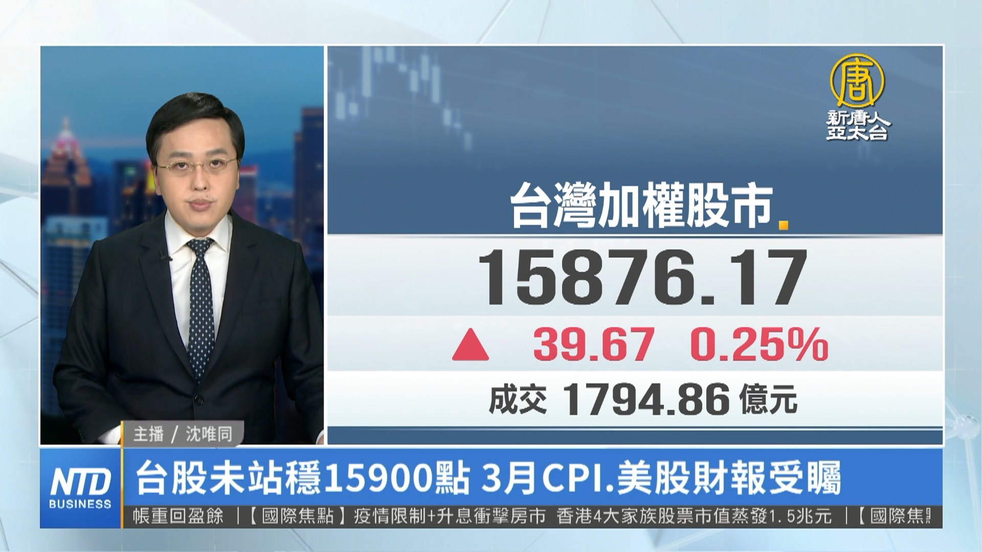 【新唐人亞太台 2023 年 04 月 10 日訊】新聞一開始帶您關心金融市場。美股上周五(7)休市一日,華爾街預期美國聯準會升息接近尾聲,美股電子盤周一走勢多空震盪。這星期聚焦週三即將公布的CPI通膨數據。另外台股週一早盤,一度攻上15900點,電子權值股買盤力道有限,台積電收在529元、鴻海平盤,加權指數震盪拉回,終場是漲39.67點。外資連二買小幅買超,三大法人合計買超15.97億,整體市場較為觀望,靜待指標企業獲利數據。