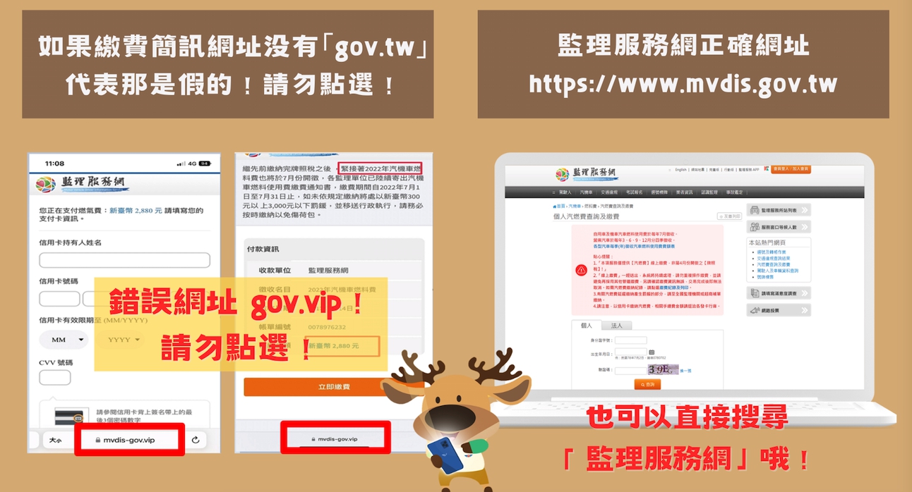 嘉義區監理所指出,繼去年罰單詐騙後,今年又有不肖份子再次利用汽燃費進行詐騙。監理服務網正確網址為「https://www.mvdis.gov.tw/」,請切勿點擊來源不明的簡訊或連結,以免上當受騙,民眾若收到繳費簡訊存有疑義,請洽各地區監理所站查證。