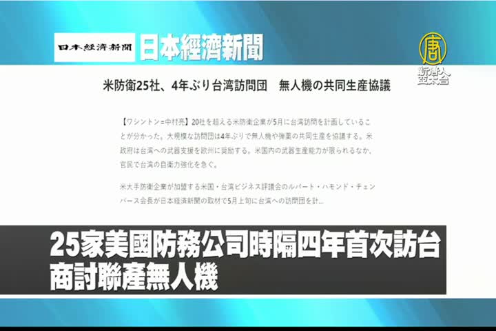 【新唐人亞太台 2023 年 04 月 12 日訊】來看到日本經濟新聞報導:25家美國防務公司時隔四年首次訪台,商討聯產無人機。