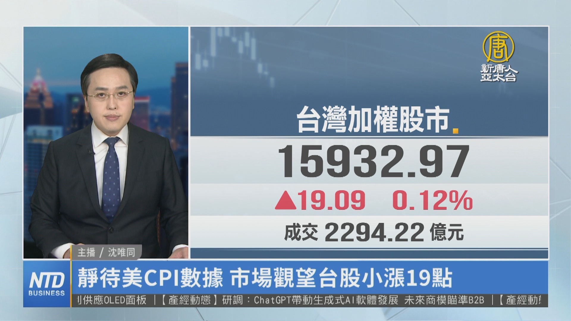 【新唐人亞太台 2023 年 04 月 12 日訊】新聞一開始帶您關心國際金融,投資人等待週三的消費者價格指數(CPI),華爾街股市週二尾盤失去動能,收盤漲跌互見,尤其CPI數據攸關FED政策走向。市場觀望氣氛影響下,權值股台積電走勢疲弱,市場資金湧向軍工、航運類股,加權指數翻終場小漲19.09點。