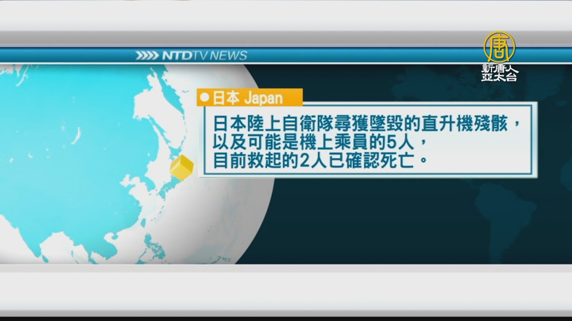 日本陸上自衛隊尋獲墜毀的直升機殘骸,以及可能是機上乘員的5人,目前救起的2人已確認死亡。
