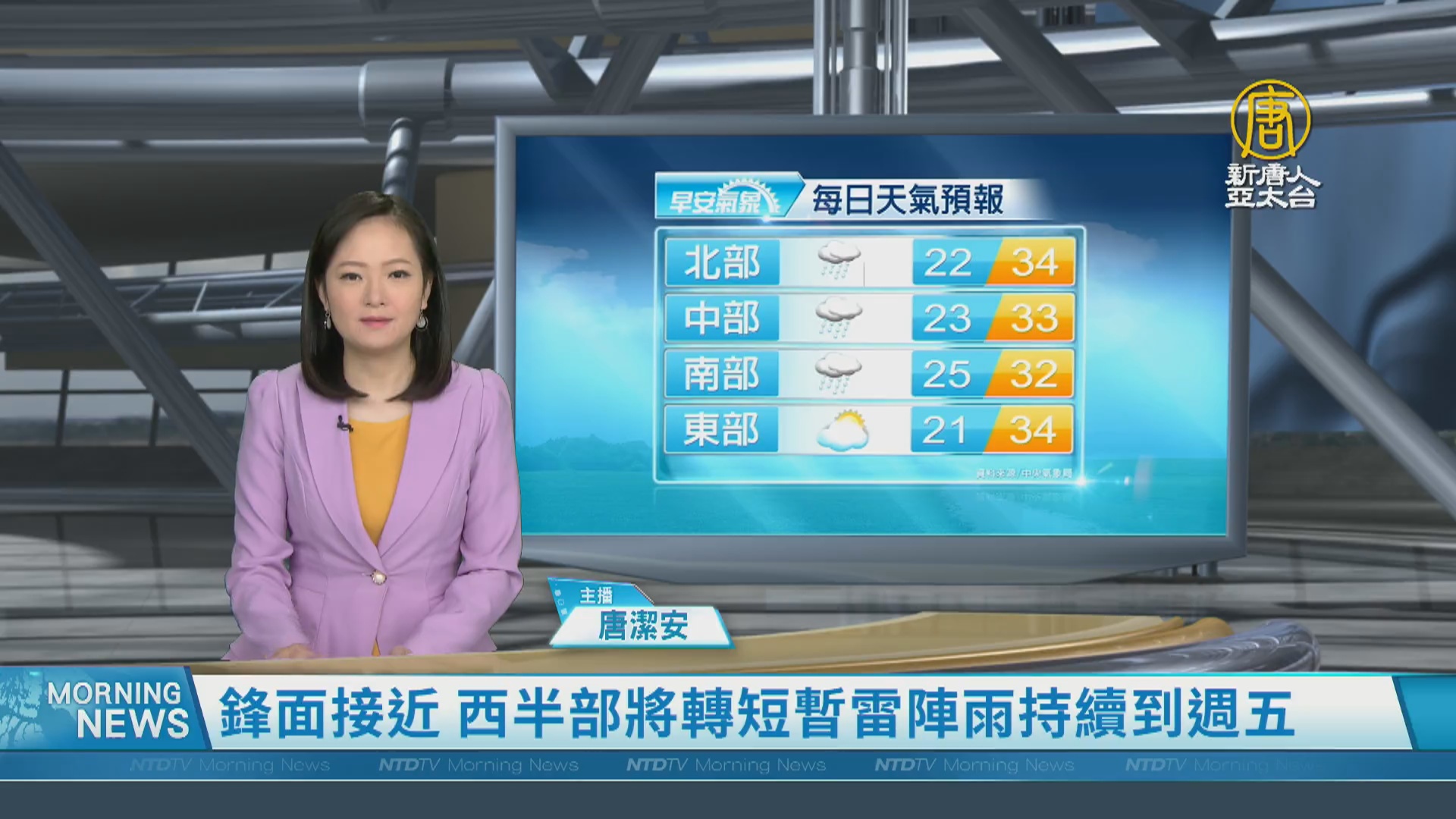 【新唐人亞太台 2023 年 04 月 19 日訊】歡迎您收看4月19日的早安新唐人,我是唐潔安,先來帶您關心天氣。 今天北方鋒面逐漸接近台灣,天氣逐漸變得不穩定,西半部地區將逐漸轉為有短暫陣雨或雷雨的天氣,降雨情形越晚會越明顯,東半部地區雲量也增多,午後山區也可能出現局部短暫雷陣雨,而在溫度方面,各地上午低溫21到25度,白天高溫則在30到34度,受西南風沉降影響,東南部易有焚風發生,花蓮縱谷及台東局部地區有36度以上高溫發生機率,外出時要適時補充水分以防中暑。帶您來看到國際媒體重要訊息。