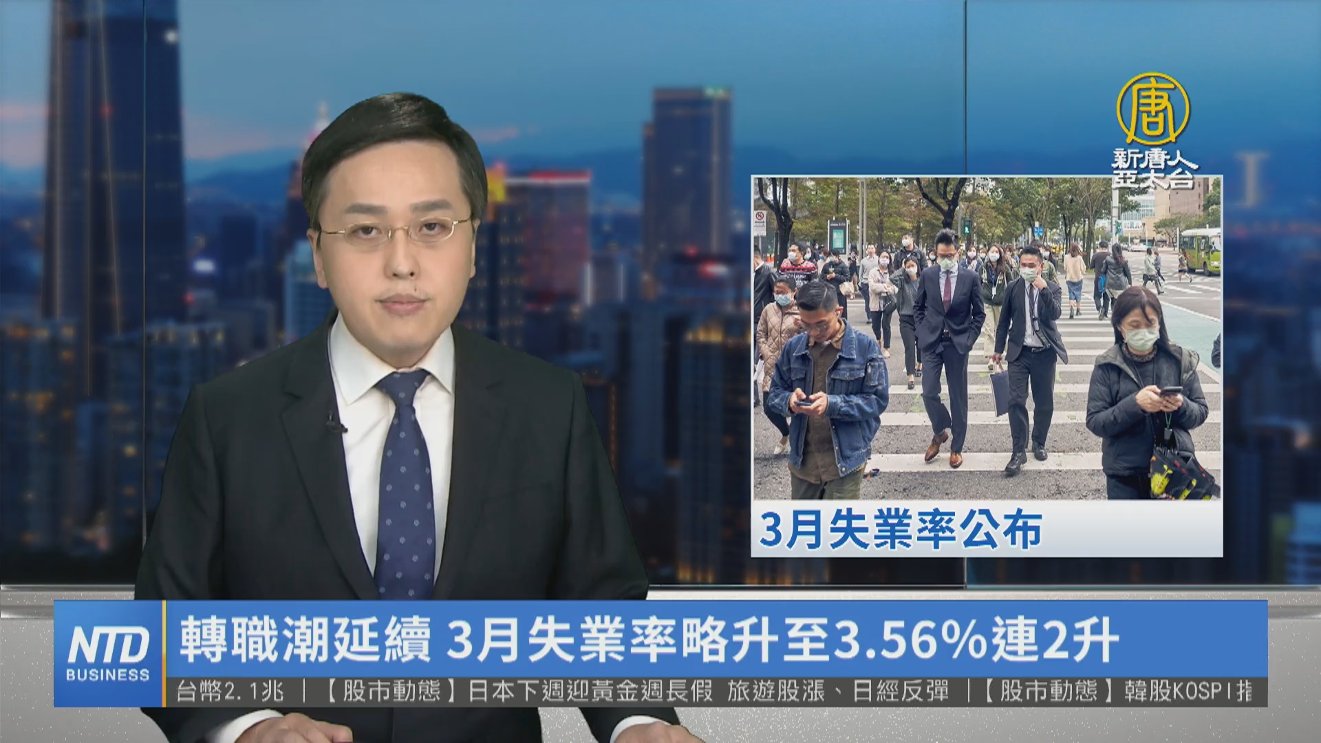 【新唐人亞太台 2023 年 04 月 24 日訊】年後轉職潮延續,主計總處公布3月失業率為3.56%,為23年同月最低,較2月上升0.03個百分點;主計總處表示,3月失業率略為回升,主要原因是年後轉職潮延續,目前失業情勢仍屬於穩定。