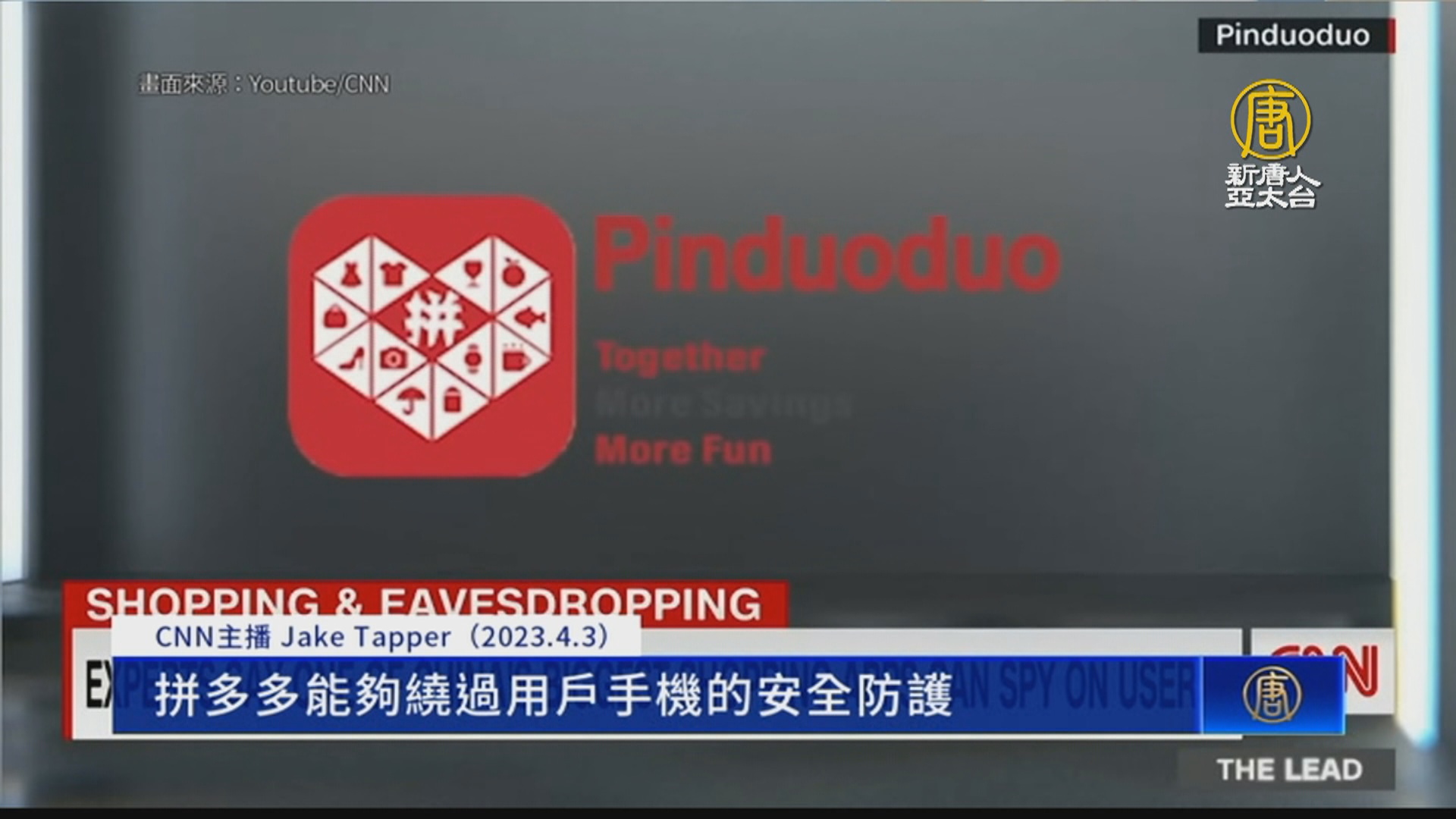 CNN主播 Jake Tapper(2023.4.3):「拼多多能夠繞過用戶手機的安全防護,它甚至可以讀取個人訊息。拼多多還有一款國際版App(Temu),在美國這裡很流行。」