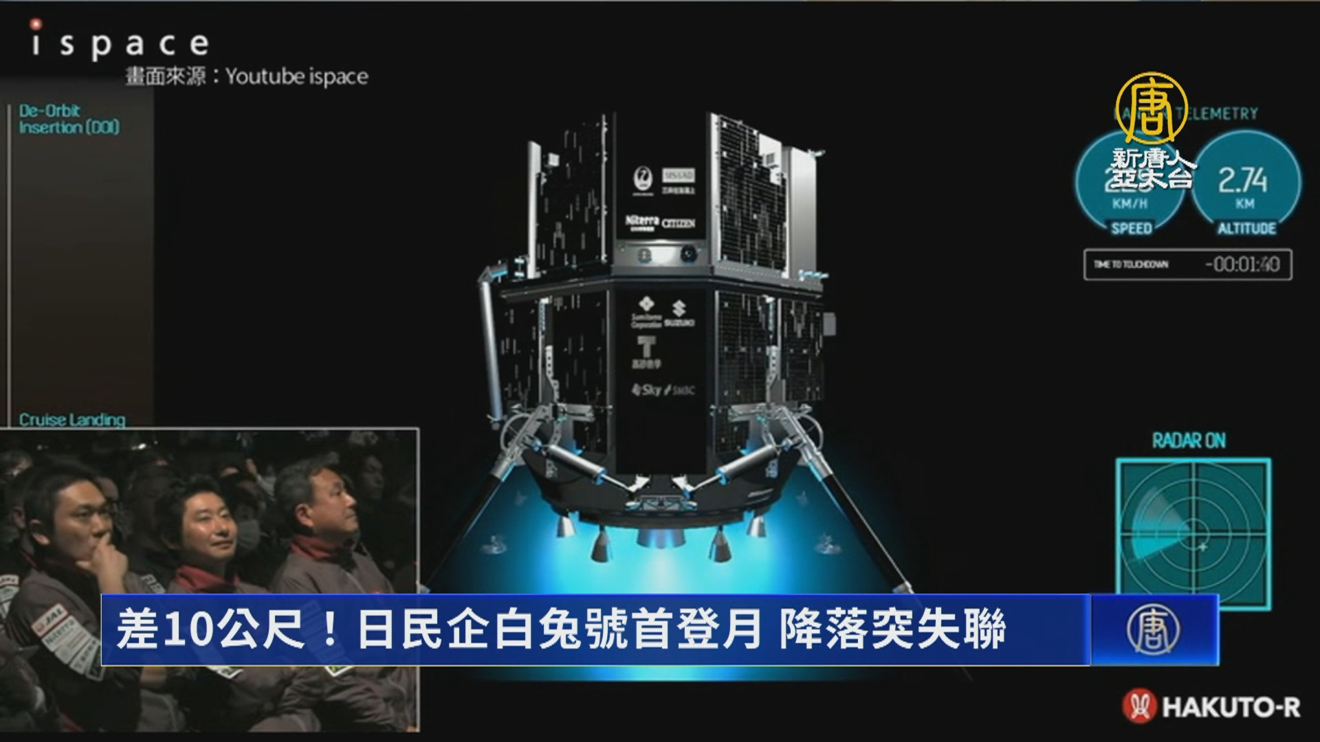 【新唐人亞太台 2023 年 04 月 26 日訊】日本航太新創公司ispace「白兔-R」M1登月艙台北時間,今天凌晨挑戰登陸月球,不過,在進行最後10公尺降落時與地面飛行控制人員失去聯繫,當時時速為25公里,ispace執行長?田武史宣布與白兔號失聯,他說,「我們無法確認成功著陸」,但他說,能夠在試圖著陸之前從登月艙上收集數據,這是偉大的成就,應該有助於為未來的任務提供信息。白兔號去年12月由美國SpaceX公司的獵鷹九號火箭搭載,從美國佛州發射升空,歷時約4個月挑戰登月計畫。