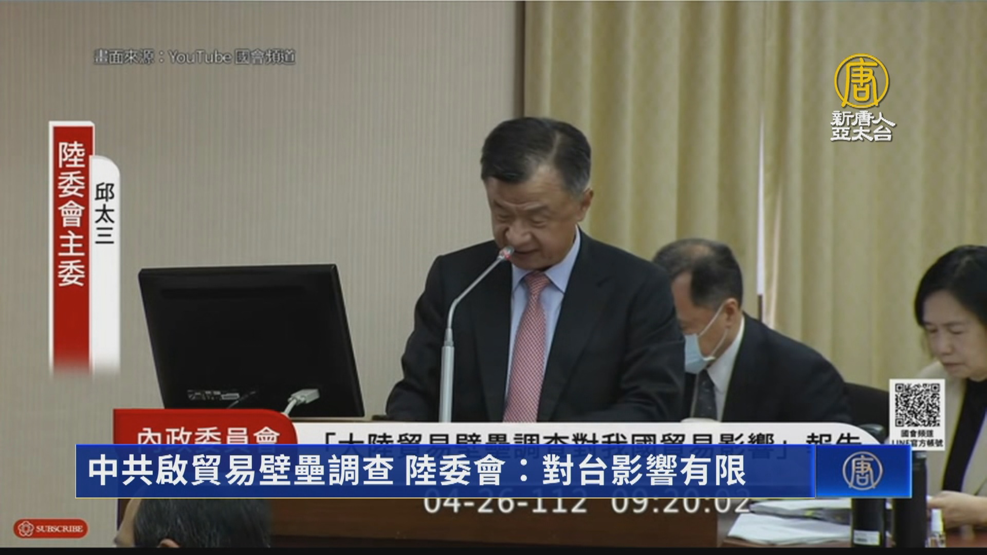 【新唐人亞太台 2023 年 04 月 26 日訊】中共商務部4月12日公告,就台灣對中國貿易限制措施,進行貿易壁壘調查。對此,陸委會26日赴立法院進行專題報告。報告內容指出,貿易壁壘調查案對於ECFA沒有直接相關。陸委會指出,貿易壁壘調查,是針對台灣未開放中國2455項產品進口。數據顯示,2022年2455項貨品對外出口248.5億美元,占總出口比重5.2%;其中,中國對我國總出口比重3.7%、總出口比重0.9%。陸委會強調,如果中共以此2455項作為報復反制手段,對台灣總體經濟影響尚屬有限。