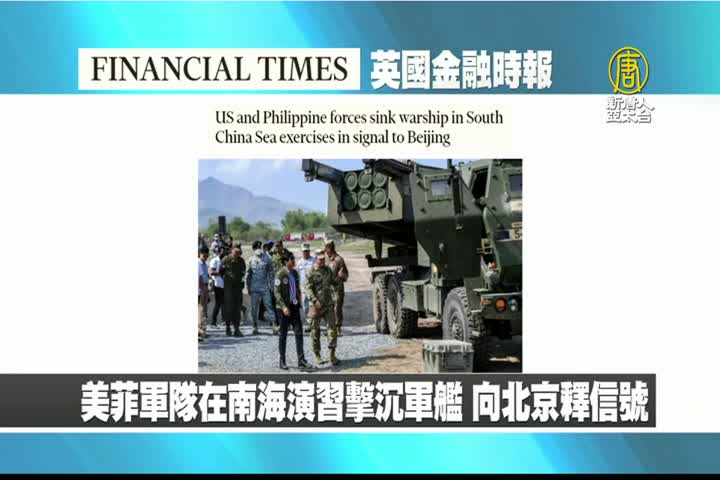 【新唐人亞太台 2023 年 04 月 27 日訊】接著是英國金融時報的報導:菲律賓總統小馬可仕主持南海擊沉軍艦的聯合軍演,為決心恢復美菲軍事聯盟,並擊退中共侵略的最明確信號。