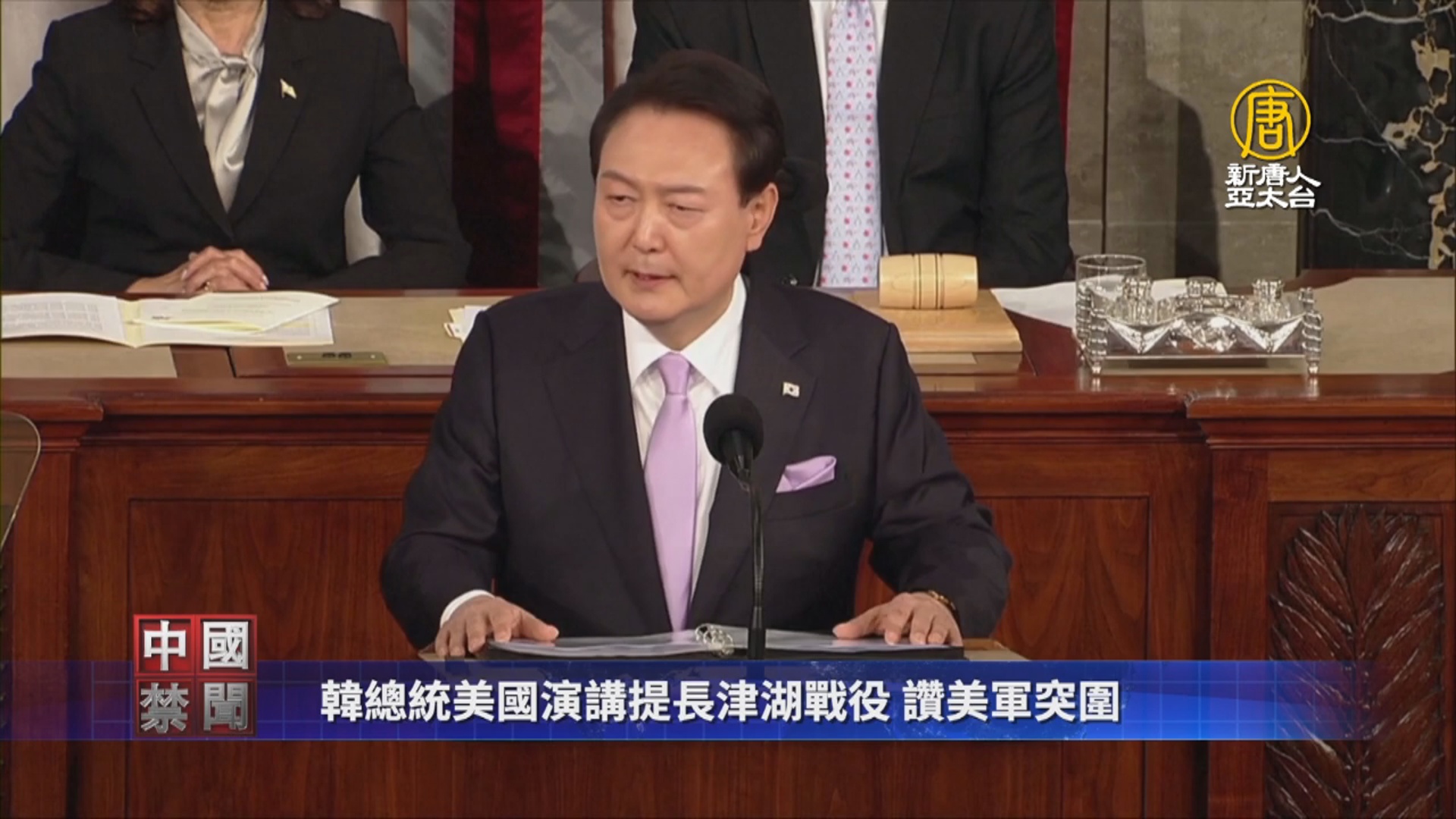 【新唐人亞太台 2023 年 04 月 29 日訊】正在美國進行國事訪問的韓國總統尹錫悅發表演講提到「長津湖戰役」時,讚揚美軍在12萬中國軍隊的包圍下突破重圍。引起各方解讀。
