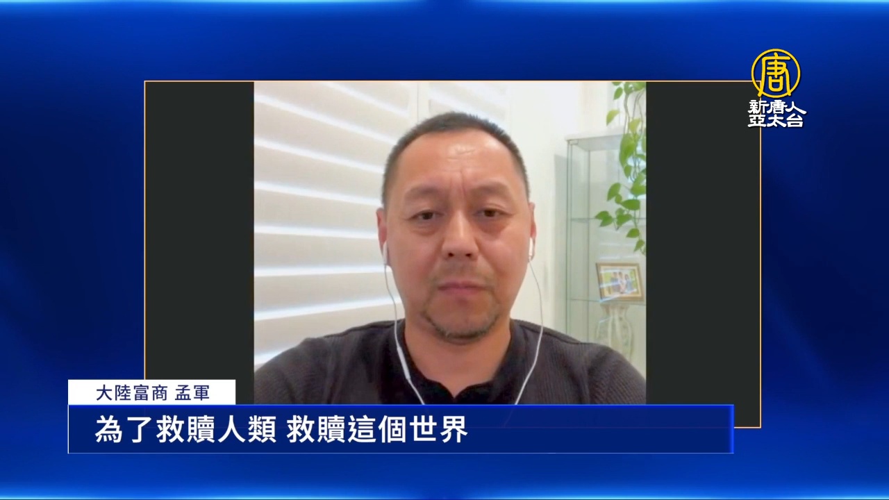 大陸富商 孟軍:「創世主創造了人類,創造了眾生,佛,神,祂的本意是希望這個世界上一切都是祥和、平靜、美好的。但是有些人變成了惡魔,變成了惡人,想為了自己的私慾去統治這個世界,統治人類,這個創世主是不允許的。我們作為人類,雖說很渺小,但是我們相信有創世主在上天看著我們,在指引著我們,我覺得我們人類還是充滿著希望。我心中有這個信念,我相信創世主會拯救人類。」