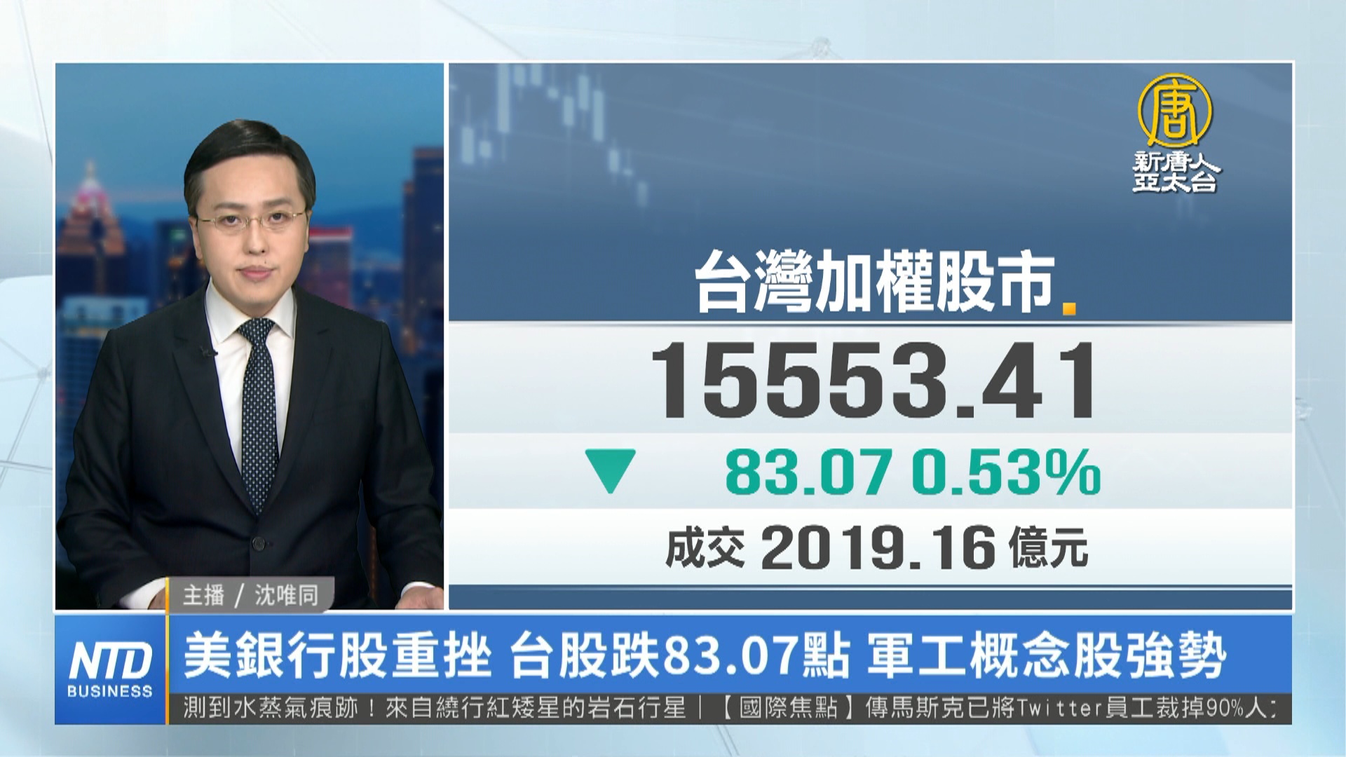 【新唐人亞太台 2023 年 05 月 03 日訊】新聞一開始,帶您看到國際股市。美國聯準會(Fed)利率決策會議是否敲定升息,以及陷入困境的銀行業憂慮再起,銀行股再度重挫,2日美元指數走貶,終止連四升。台股受台積電、航運股跌勢拖累,今天(3日)開盤下挫,尾盤跌勢收斂,不過終場仍下跌83.07點,收盤指數15,553.41點,成交量2,013.79億元。台美國防產業合作論壇今天(3日)登場,帶動軍工概念股表現相對亮眼,其中航太類股較為強勢,晟田股價一度觸及漲停,亞航盤中漲幅超過4%,寶一、漢翔更創下新天價。