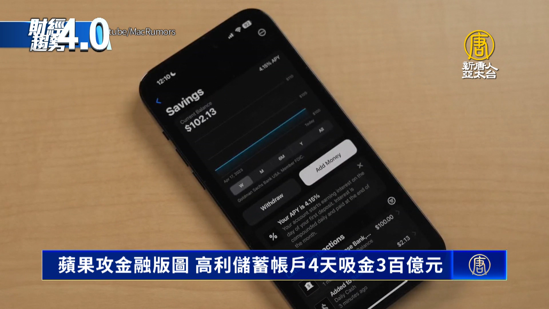 【新唐人亞太台 2023 年 05 月 06 日訊】歡迎回來,蘋果拓展金融服務的野心持續擴大,從2014年推出Apple Pay之後,不斷有新動作,今年4月推出儲蓄帳戶服務,年利率高達4.15%,推出的首周便吸引近10億美元,約新台幣3百億元的存款。