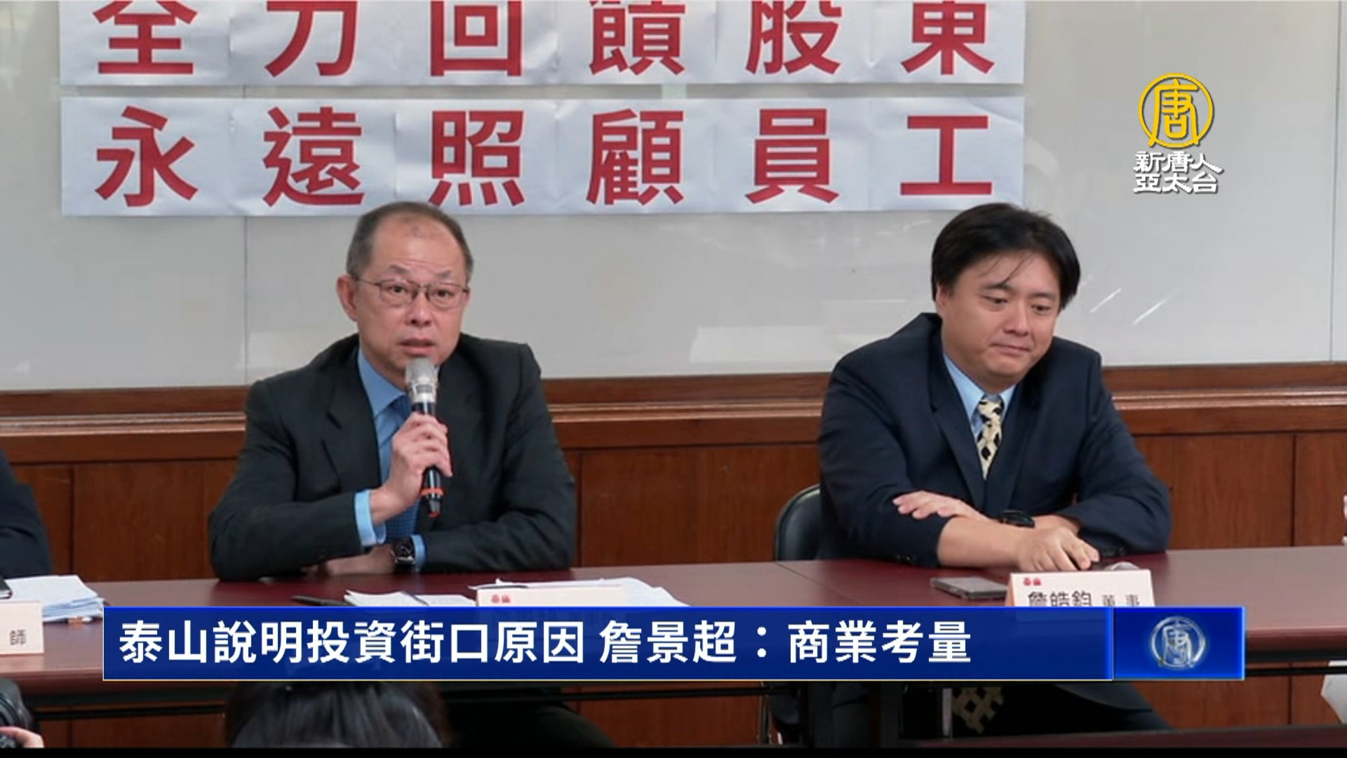【新唐人亞太台 2023 年 05 月 09 日訊】在台灣經營長達70年的食品業者泰山公司,近期陷入公司派與市場派,經營權之爭,泰山董事長詹景超今(9)天召開記者會,對外說明以36億,轉投資街口支付的主要原因是商業考量,針對市場派動作頻頻,公司派方面也做出回應。