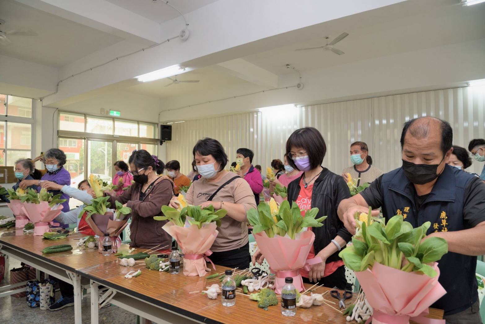 鹿草社區發展協會理事長鄧文榮指出,這次使用的花材是鹿草著名的農產秋葵、玉米等蔬菜,長輩們都很開心能夠參與這次的活動。