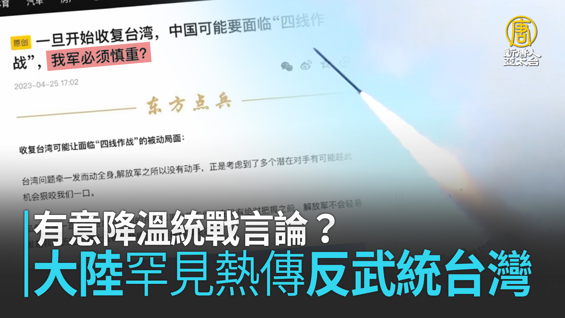 【新唐人亞太台 2023 年 05 月 16 日訊】繼續來看到,近日有一些反對武統台灣的聲音,罕見在大陸網路上流傳。外界認為,中共目前內外交困、處境不利,中共沒有刪除相關言論,很可能是為了暫時緩解壓力,有意適當地降溫武統言論。