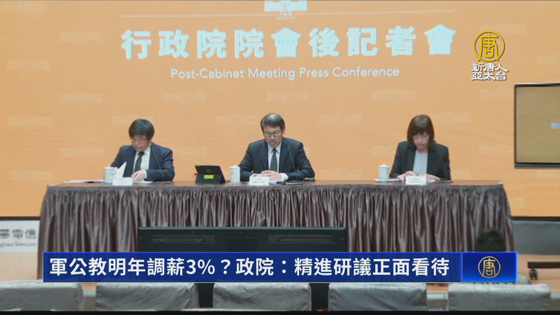 【新唐人亞太台 2023 年 05 月 18 日訊】財政部次長阮清華昨天(17日)在立法院表示,軍公教如果調薪3%,財政應該可以支應。對此,行政院今天(18日)回應說,政府非常感謝軍公教人員長期付出,明年軍公教的調薪,行政院持續精進研議,持正面態度看待。