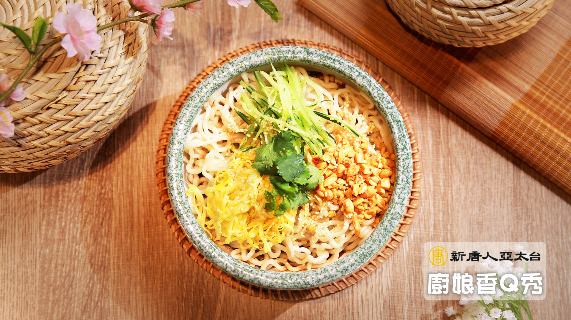 5. 麵上再放上蛋絲、小黃瓜絲、熟的花生碎及白芝麻,最後以香菜點綴完成。